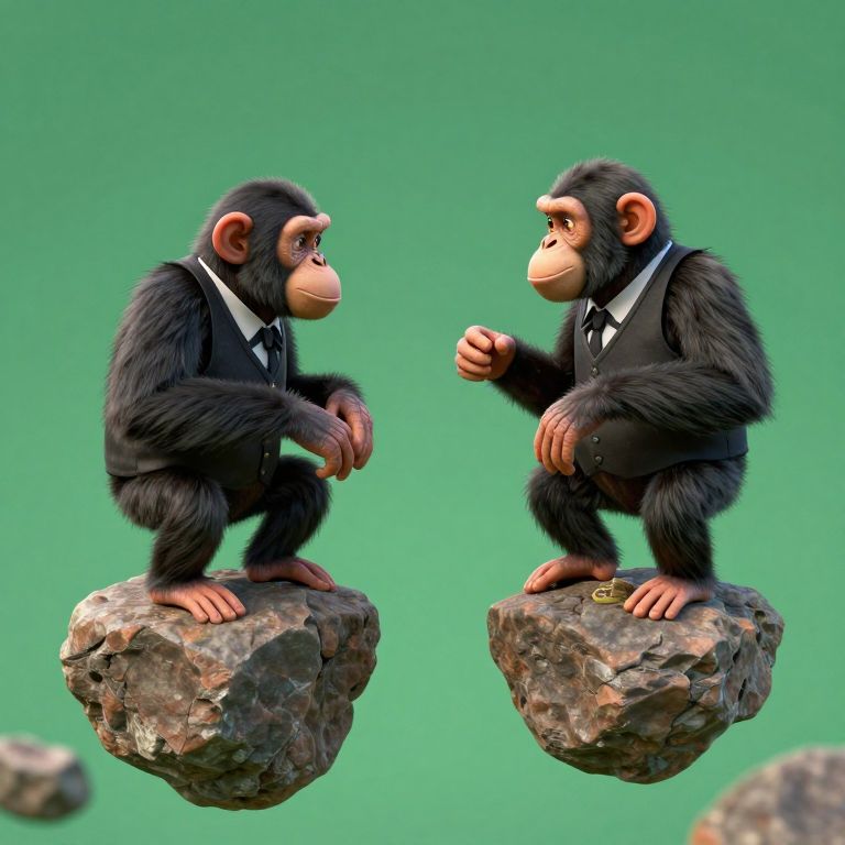 A digitally rendered image features two anthropomorphic baby chimpanzees, dressed in black tuxedos with white shirts and black bow ties, standing on small rocky outcrops against a solid green background. Both chimps are facing each other, with one raising its right hand in a gesture. The fur on the chimps is black and textured, while their faces are orange with expressive eyes. The rocks they stand on are detailed with gray and brown hues, and small gold coins are placed near their feet. The overall style is cartoonish and playful.