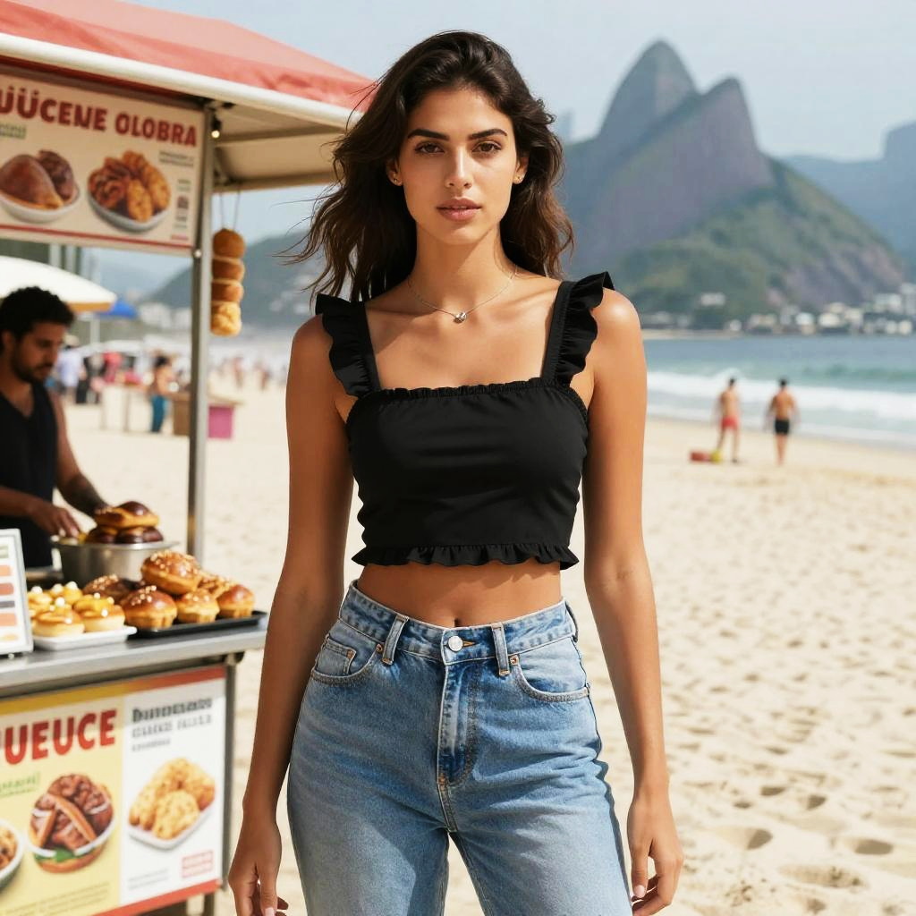 A woman in a sporty chic outfit, featuring a black crop top with a halter neckline and high-waisted athletic shorts, minimalistic design, neutral makeup, and straight long hair, enjoying a Street Food Experience at Istanbul Spice Bazaar, in a vibrant selfmade hero visual style. Sexy. Pretty face and beutiful eyes