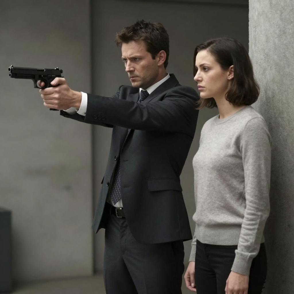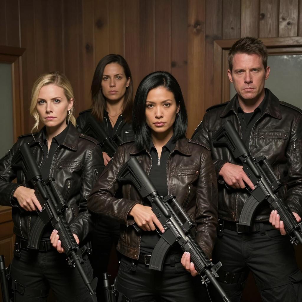 Four armed agents in dark leather jackets stand in a dimly lit, wooden-paneled room. Three women and one man hold black assault rifles. The blonde woman on the left has a focused expression. The black-haired woman in the center looks forward. The man on the right has a serious expression. The woman in the center has medium-length black hair. All agents are positioned closely, facing forward.