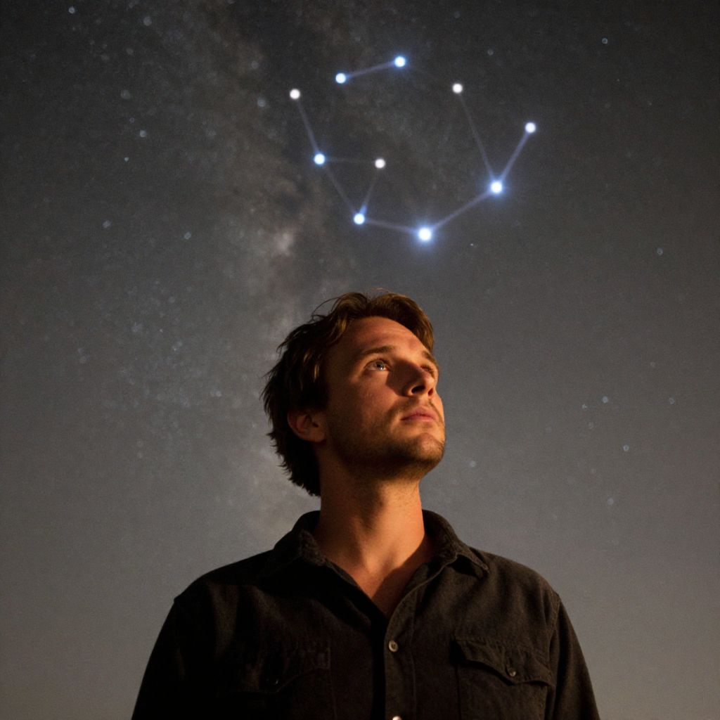 Captivating portrait of a man lost in contemplation, gazing upwards towards the celestial expanse, as the majestic constellation Ursa Major shines brightly above him, its radiant beams illuminating his serene expression, set against a breathtaking starry night sky, medium shot, soft focus, warm golden hour lighting. Man has masculine face and piercing eyes