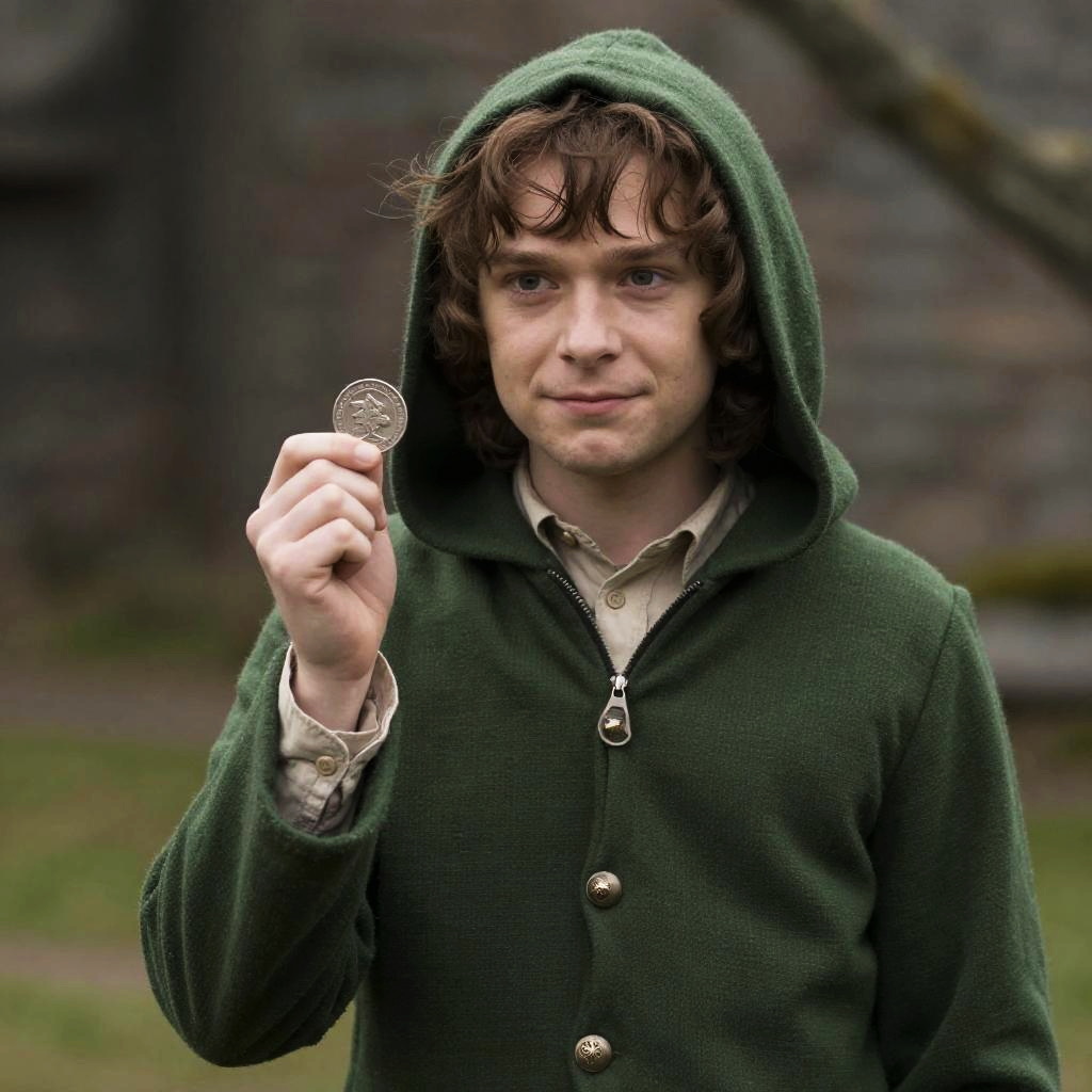 Lord the rings frodo costume, young man in a green hoodedie holding a silver coin