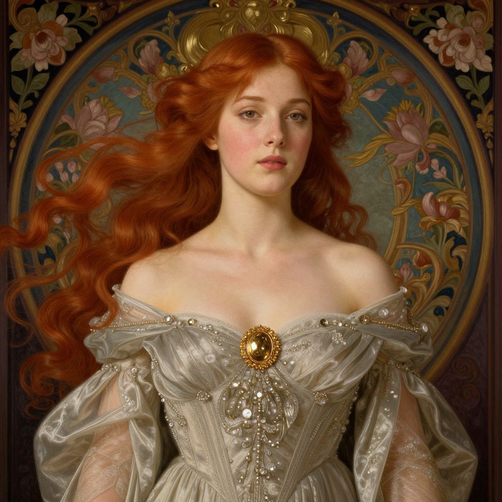 A digital artwork inspired by Evelyn de Morgan, featuring a classical-style depiction of a woman with flowing red hair, adorned in an elegant off-the-shoulder gown embellished with a gold brooch, set against a richly detailed ornate background with intricate floral patterns.