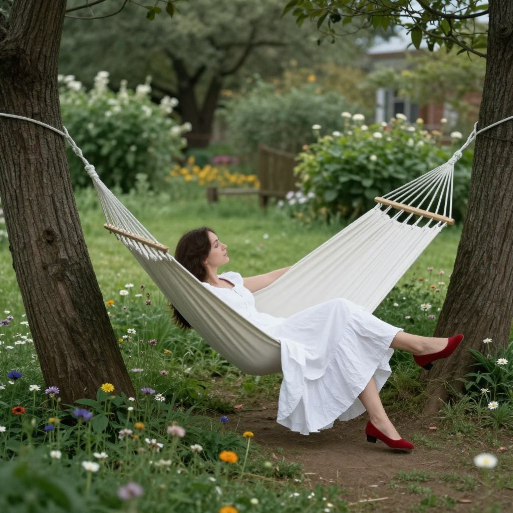 Woman lounging in a white hammock suspended between two trees in a serene garden, wearing a flowing white dress and red shoes, surrounded by lush greenery and scattered wildflowers.