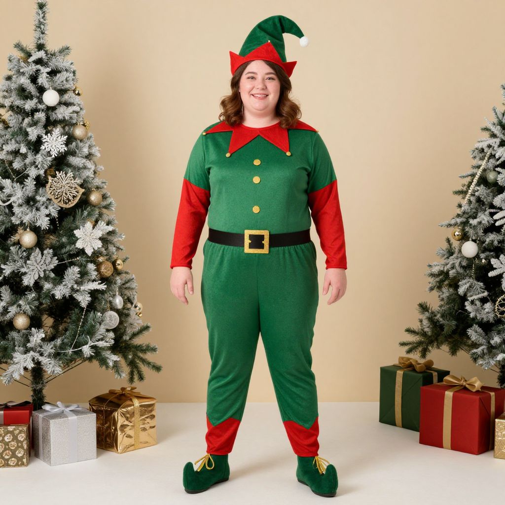 Plus Size Buddy Elf Costume, dressed in elf costume standing in front of christmas decorations
