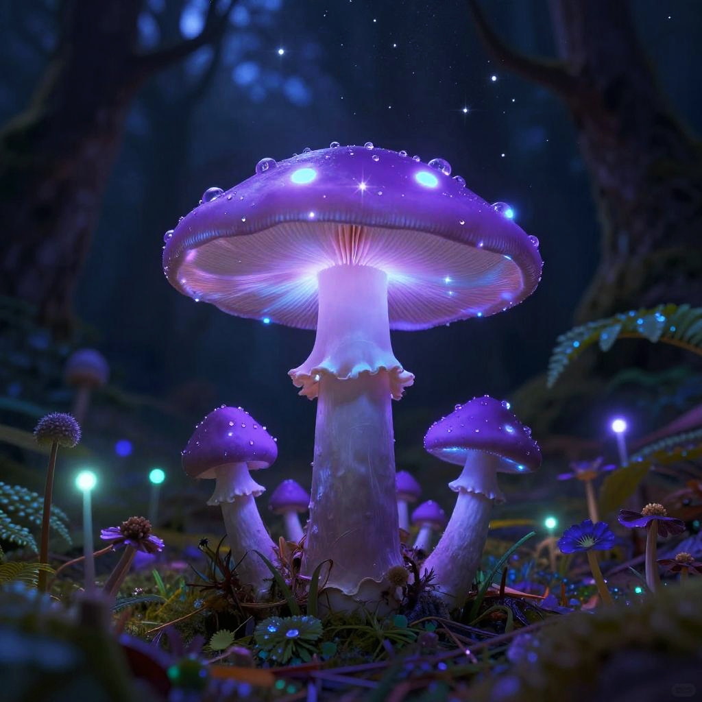 Glowing purple mushroom under a starry night sky, surrounded by luminescent plants and sparkling dew, fantastical and otherworldly forest setting, lush and vivid colors
