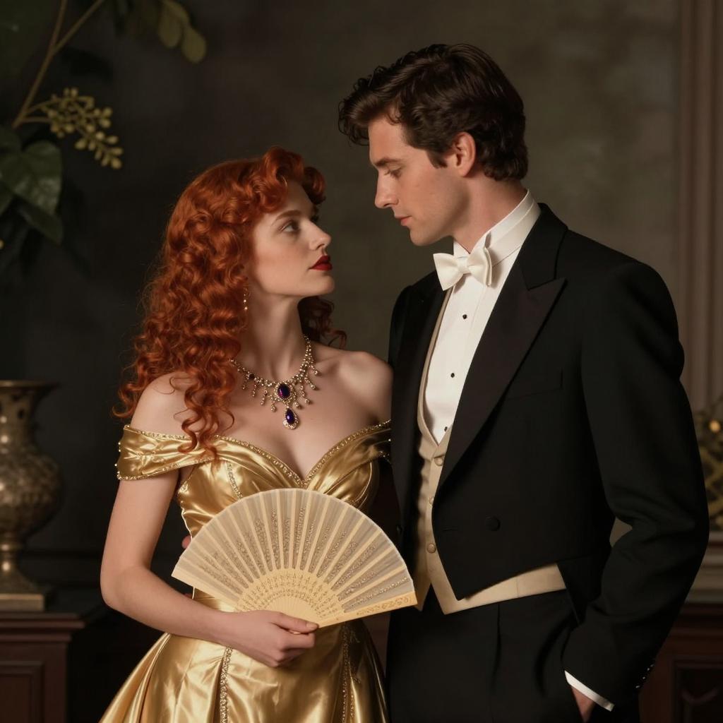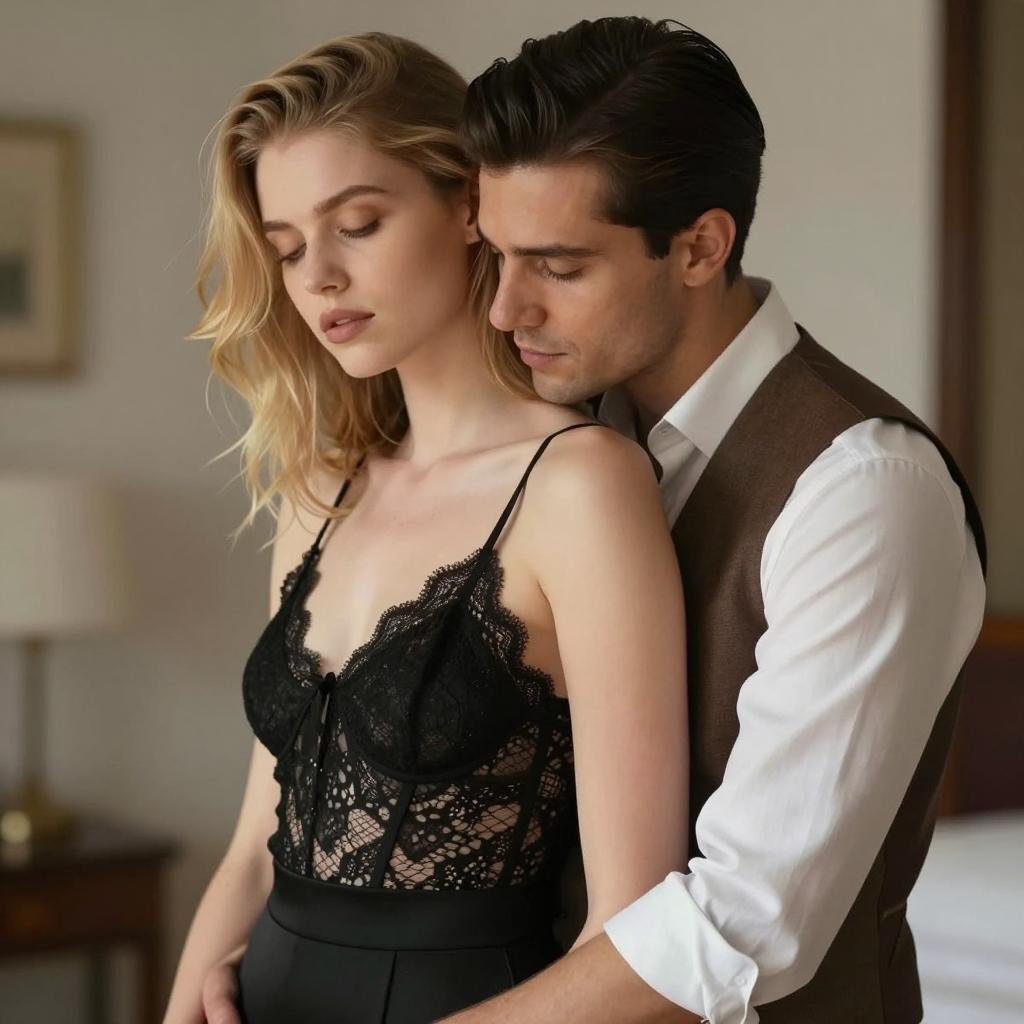 A man and woman on a blue, ornate couch. The woman has blonde hair, pearl earrings, a choker, and a pink, lace-trimmed dress with a large bow. The man has brown hair, a black and white ruffled shirt, and a dark velvet jacket with silver embroidery. They lean close, eyes locked, man's head slightly tilted towards woman.