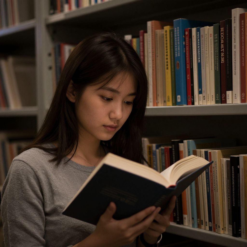 Photograph of an Asian woman with long black hair, wearing a gray sweater, reading a book in a library with colorful, neatly arranged bookshelves