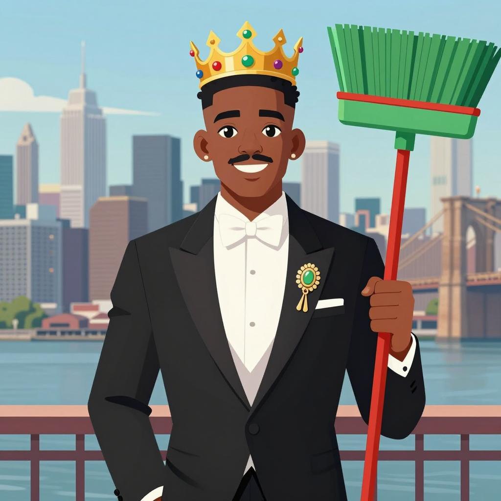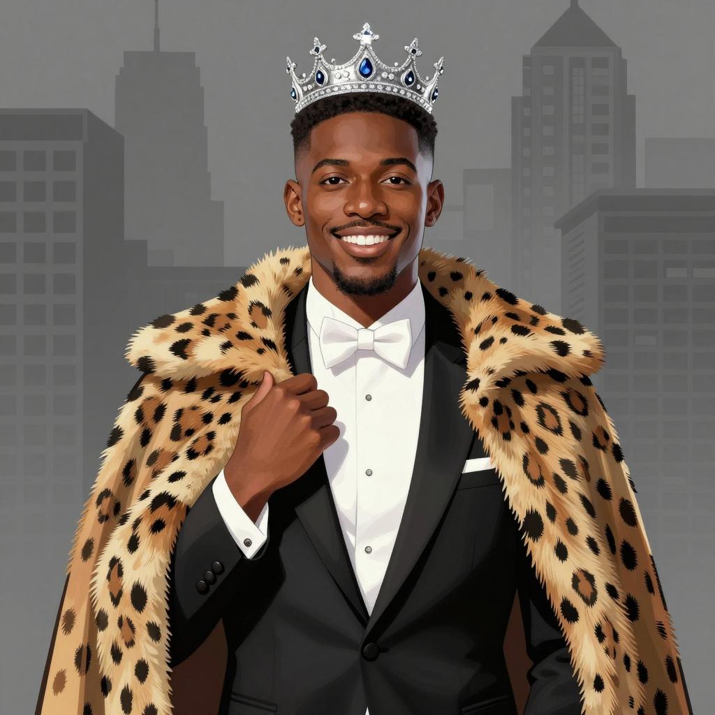 Black man with dark skin, smiling, wearing a silver crown with jewels, black tuxedo with white bow tie, and leopard fur cape. His right hand grips the cape's shoulder. Background: gray, abstract cityscape with tall buildings. Digital illustration with a comic book style.