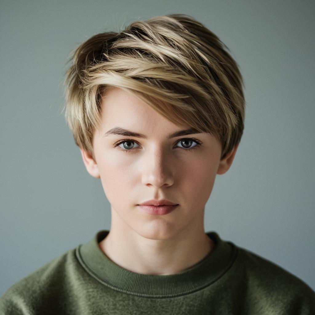 Photorealistic close-up portrait of a teenage boy with styled short brown hair featuring blonde highlights. The boy has blue eyes, a neutral expression, and is wearing an olive green oversized sweatshirt. The image is lit with soft natural light against a blurred gray background, showcasing realistic skin texture and subtle shadowing.