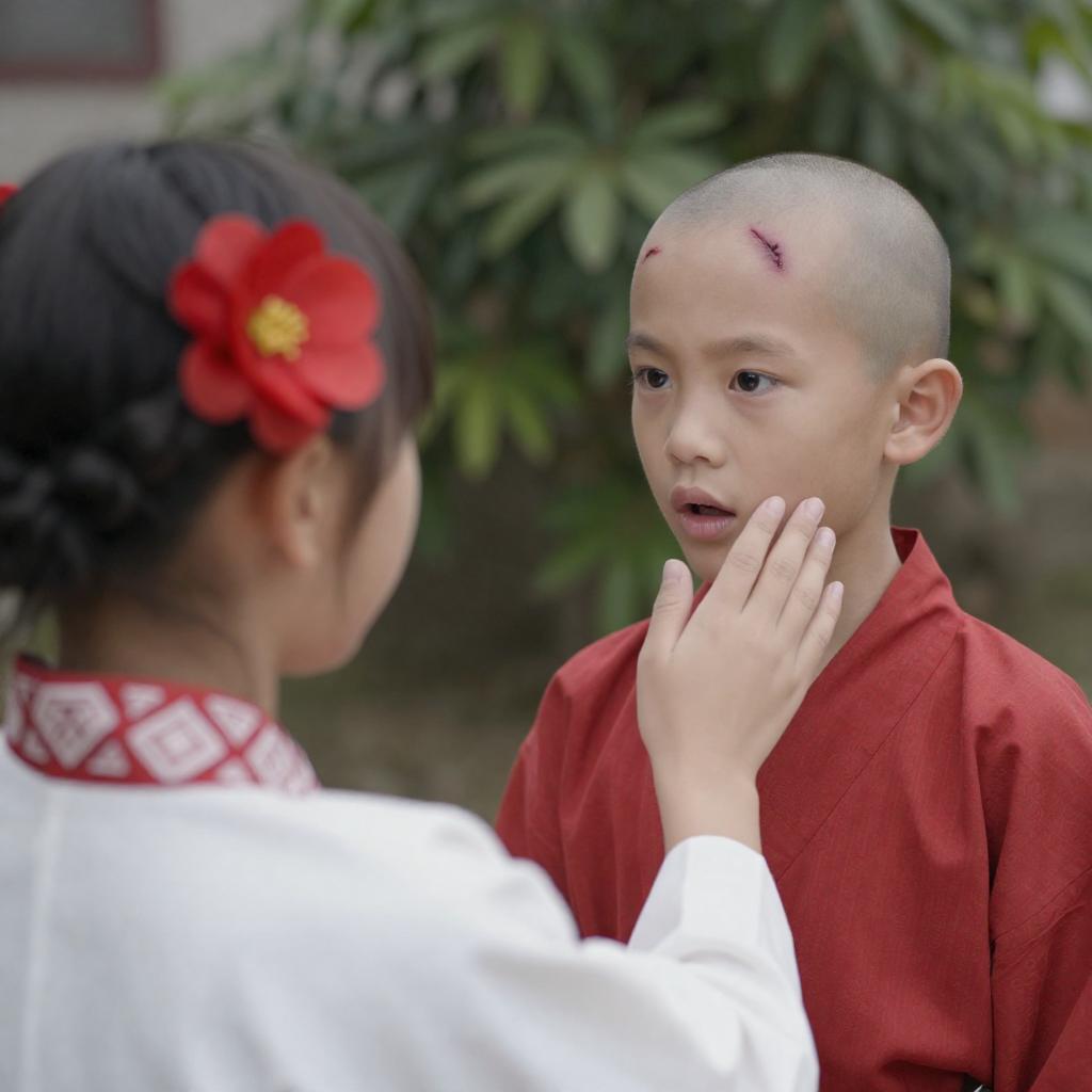 Photograph of a bald Asian boy with a scar on his head, looking at a girl with black hair adorned with red flowers. Girl touches boy's face with her right hand. Both wear red and white patterned clothing. Green plants in background. Girl's back to camera. Boy's expression is surprised.