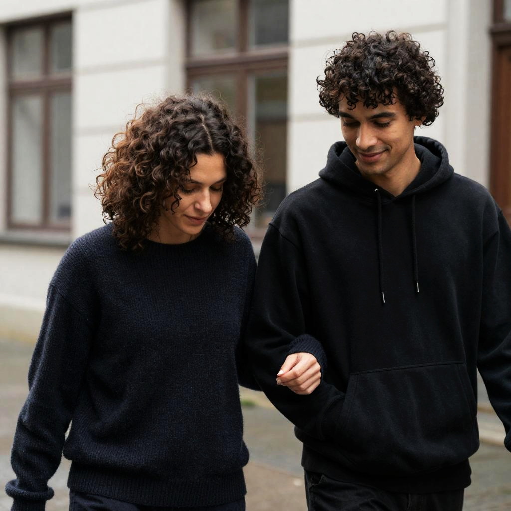 Photograph of two people walking outdoors. Woman with curly brown hair, wearing a dark knitted sweater, looks down while adjusting her hand. Man with curly dark hair, wearing a black hoodie, smiles slightly. Background includes a building with large windows. Rain is visible. Both people are close together, leaning slightly towards each other.