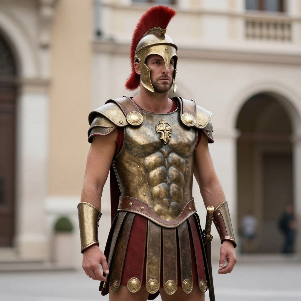 Spartan Warrior Costume, man dressed in a roman gladia costume standing in front of a building