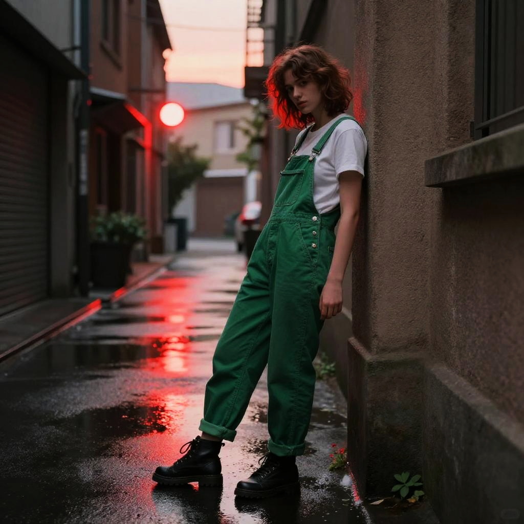 1girl, dawn, red_light, alley, leaning, wet_pavement, reflections, green_overalls, quiff, vivid, cinematic, masterpiece