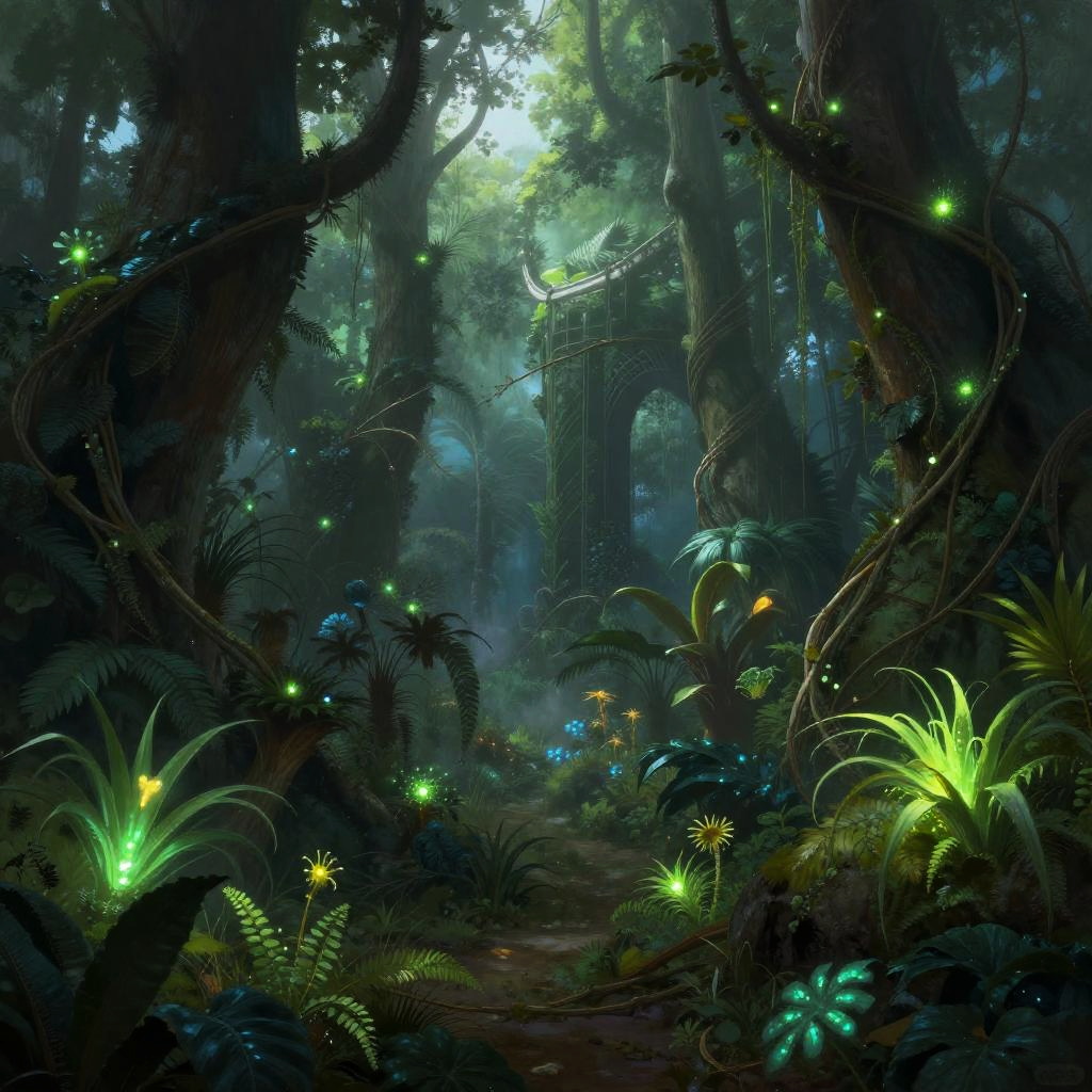 Végétal themed futuristic forest with bioluminescent plants and glowing vines, misty environment, deep greens and neon highlights, mysterious ambiance, high detail, photorealistic digital painting.