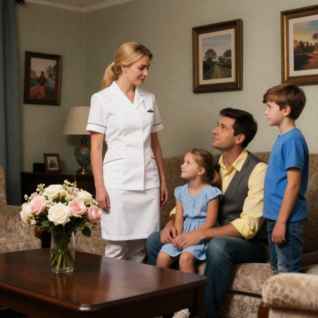 Photograph of a bedroom scene. Man in bed with white sheets, wearing a white cap and gown, smiling. Blonde woman in white nightgown, kneeling on second bed, looking at him. Patterned wallpaper, two lamps, orange headboards. Blue blanket on first bed. Warm, yellow lighting.