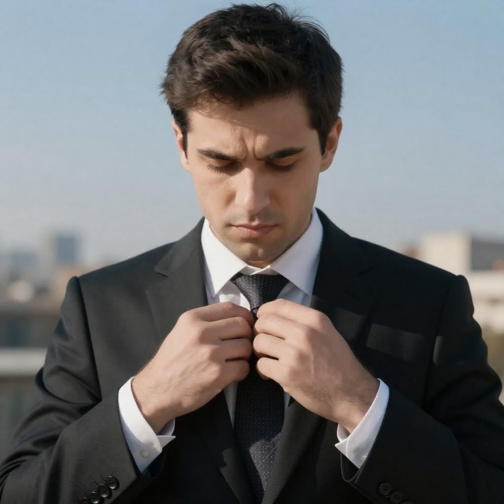 Young man with short dark hair wearing a black suit and white dress shirt, adjusting a dark patterned tie. The background features a clear blue sky and a blurred cityscape. The man's expression is focused and serious.