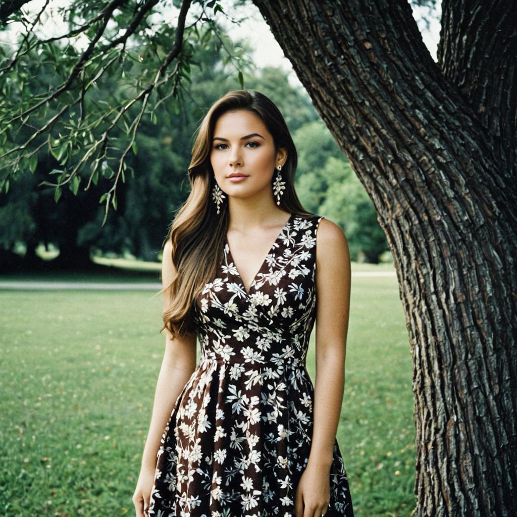 Emerald green semi formal,1girl, solo, dress, green dress, brown hair, long hair, tree, outdoors, lips, bare shoulders, looking at viewer