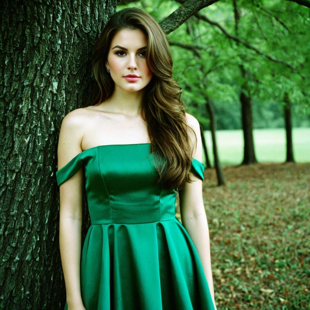 Portrait of a young woman with long brown hair wearing an off-the-shoulder emerald green semi-formal dress standing against a tree in a lush green outdoor setting. The woman has bare shoulders and a neutral expression, with soft makeup highlighting her lips.