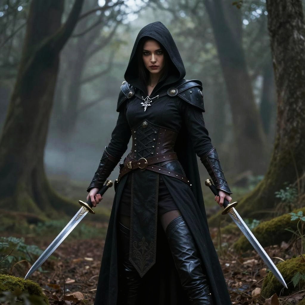 Female rogue characters wielding twin daggers, cloaked in shadow, poised in a misty forest clearing, intricate costume design, cinematic lighting