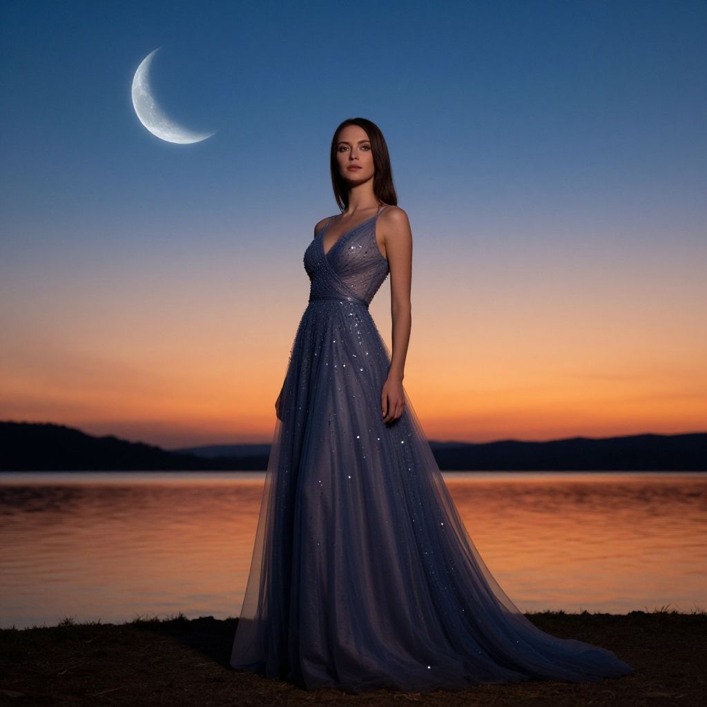 A captivating woman stands gracefully against a twilight sky, adorned in a flowing, starry gown. The serene landscape features a gentle lake reflecting the orange and blue hues of dusk, complemented by the crescent moon and scattered stars. This enchanting scene captures the essence of fantasy and ethereal beauty.