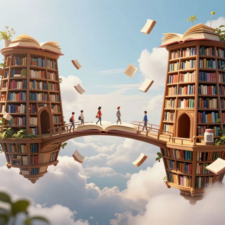 A whimsical digital artwork depicts a fantastical bridge made of open books spanning between two grand, floating libraries, with people strolling across and books magically flying through a serene, cloud-filled sky, evoking a dreamlike, high-definition fantasy world.