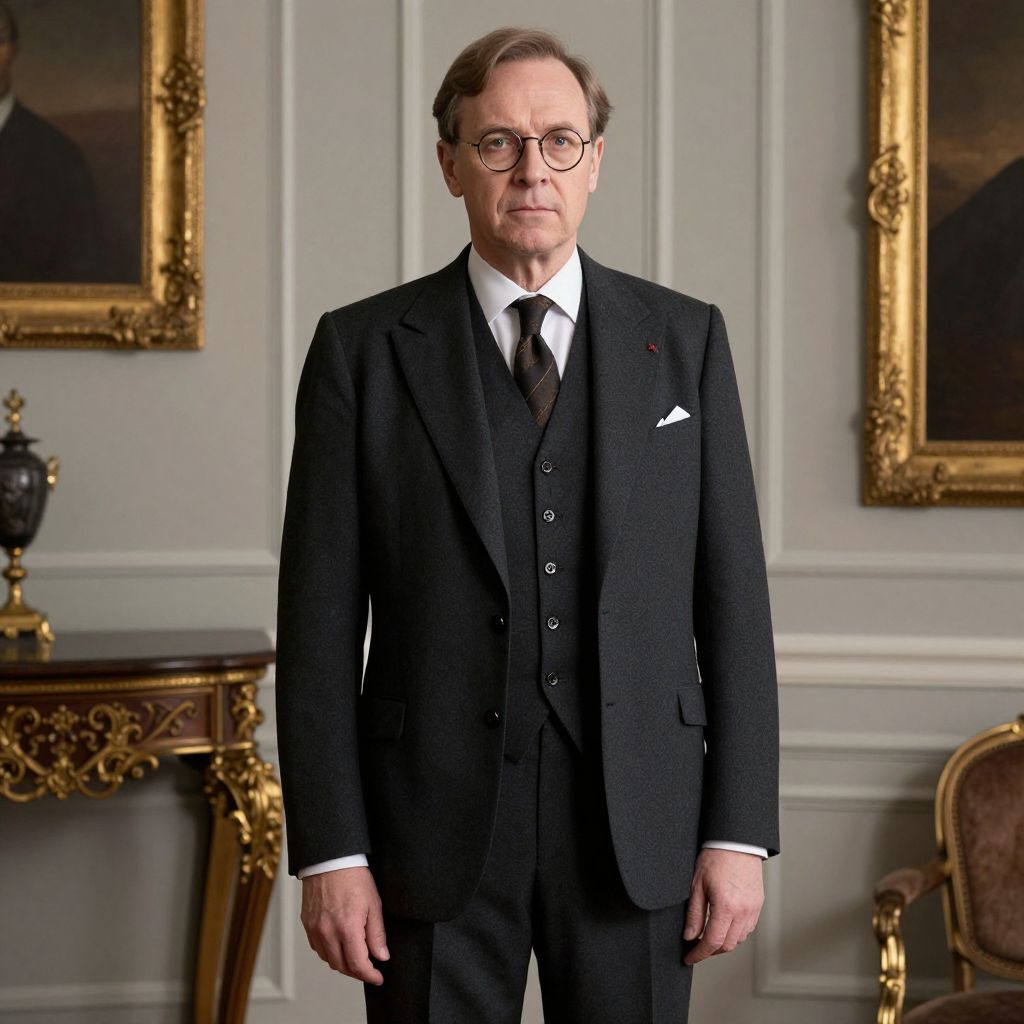 Karl Heisenberg Costume, a man in a suit and glasses standing in a room