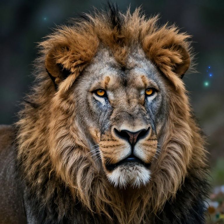 Photograph of a majestic male lion with a thick, golden-brown mane, intense amber eyes, and a focused gaze, set against a dark,