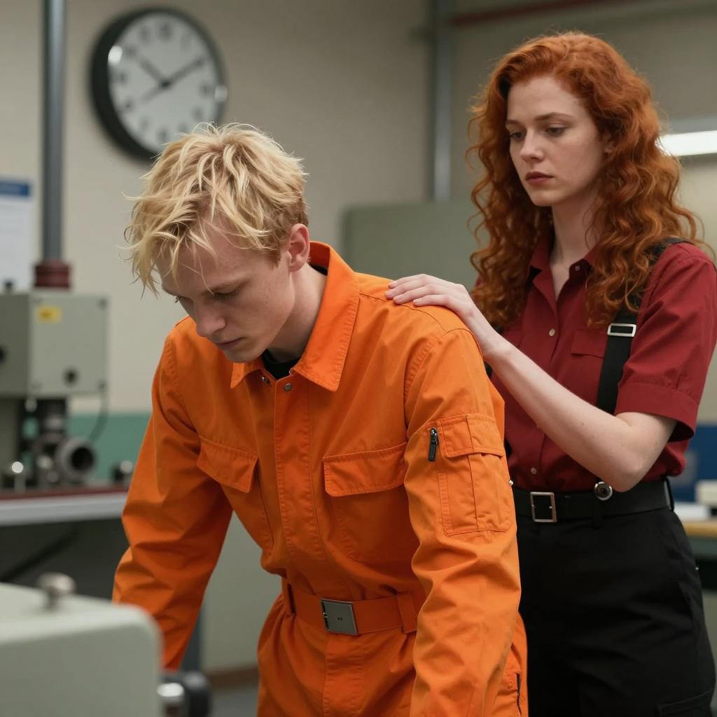 Photograph of four people in an indoor scene. A white man with short brown hair, black shirt, and open beige jacket sits on the floor. A white woman with curly blonde hair, white blouse, and blue skirt stands to his right. A black man with short curly hair, black and orange striped shirt, kneels on the floor to his left. Another person's arms and legs, covered in blood, are sprawled between them. Background includes framed pictures, plant, and metal ladder. Intense facial expressions on the white man and black man.