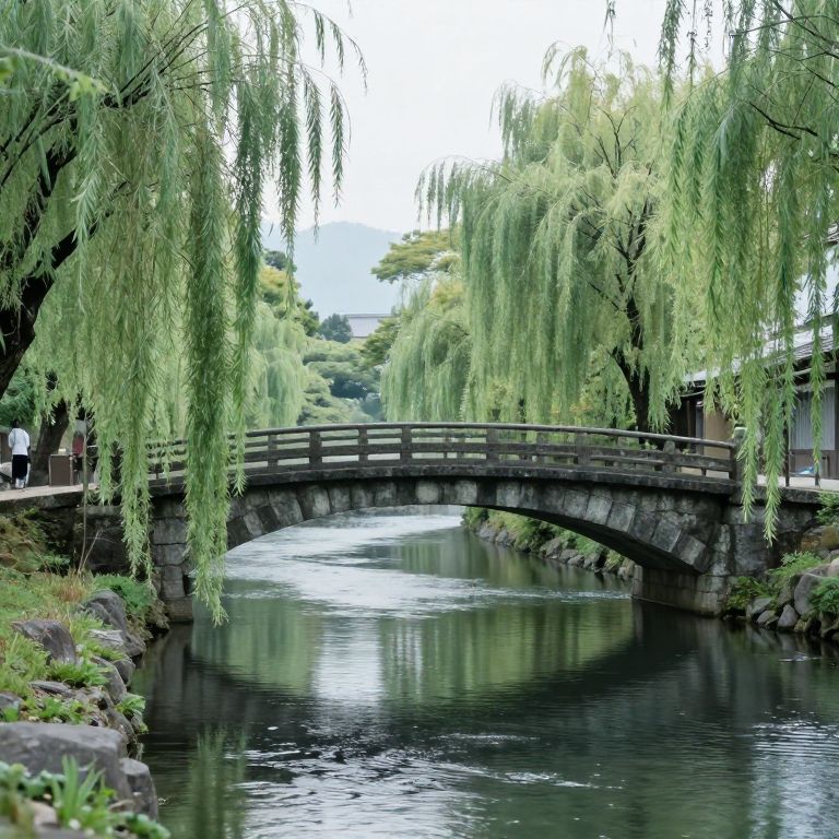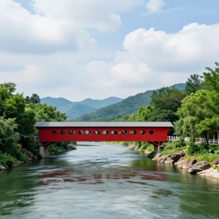 A serene landscape showcases a vibrant red covered bridge spanning a tranquil river, flanked by lush green trees and rocky embankments, with distant mountains and a partly cloudy sky completing the picturesque scene.