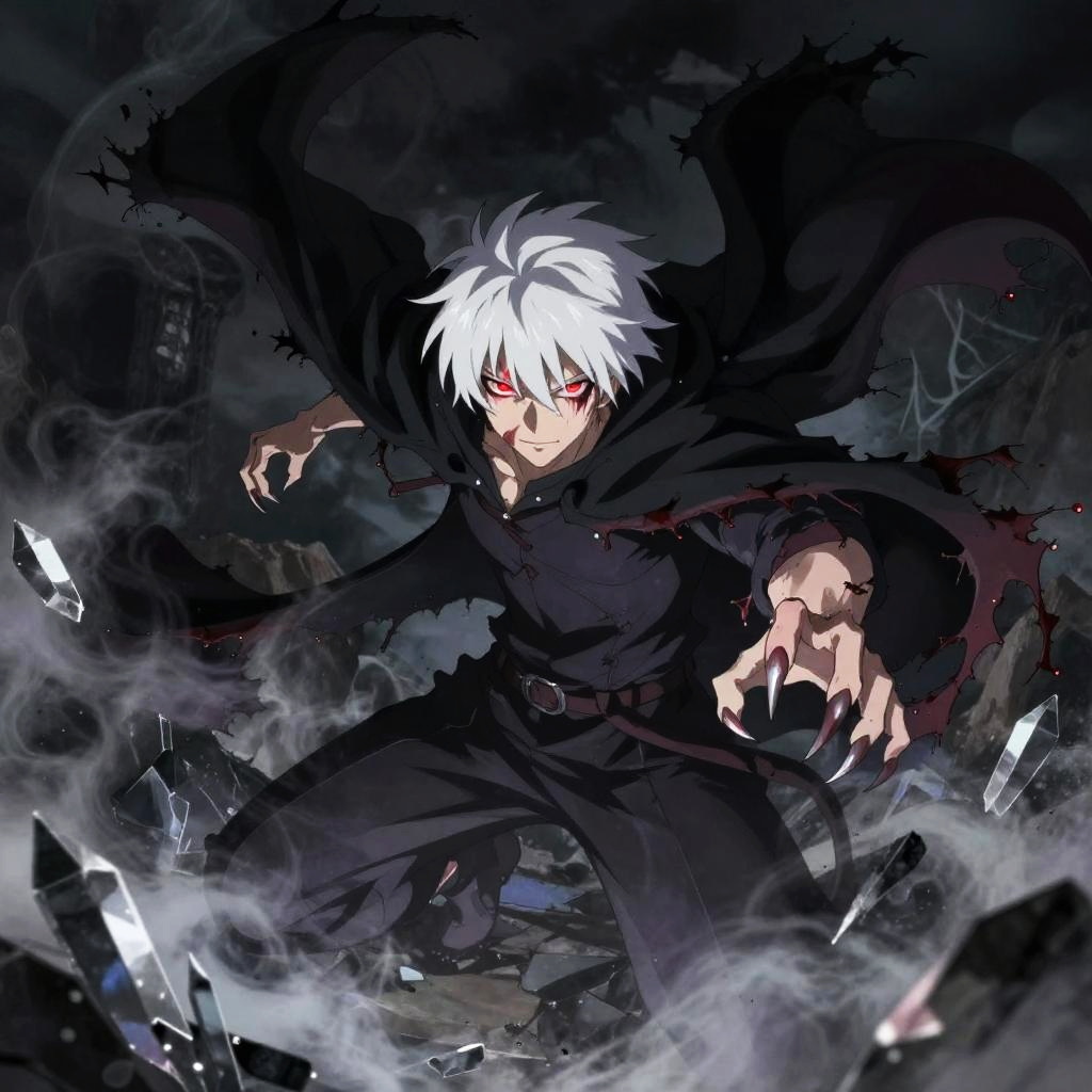 Manga-style black-and-white drawing of a mysterious, hooded, dark-haired man with intense eyes, holding a dagger, surrounded by occult symbols in