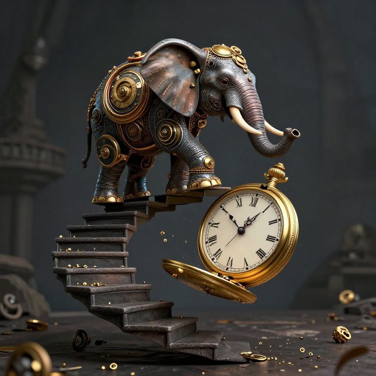 Digital art of a silver, intricately patterned elephant with gold accents, stepping on a spiral staircase, holding a large, gold pocket watch with a