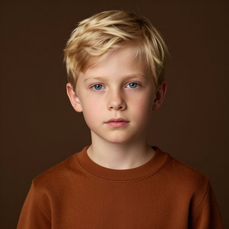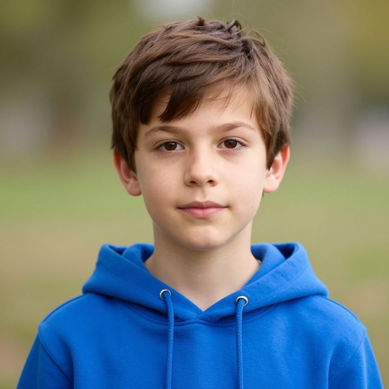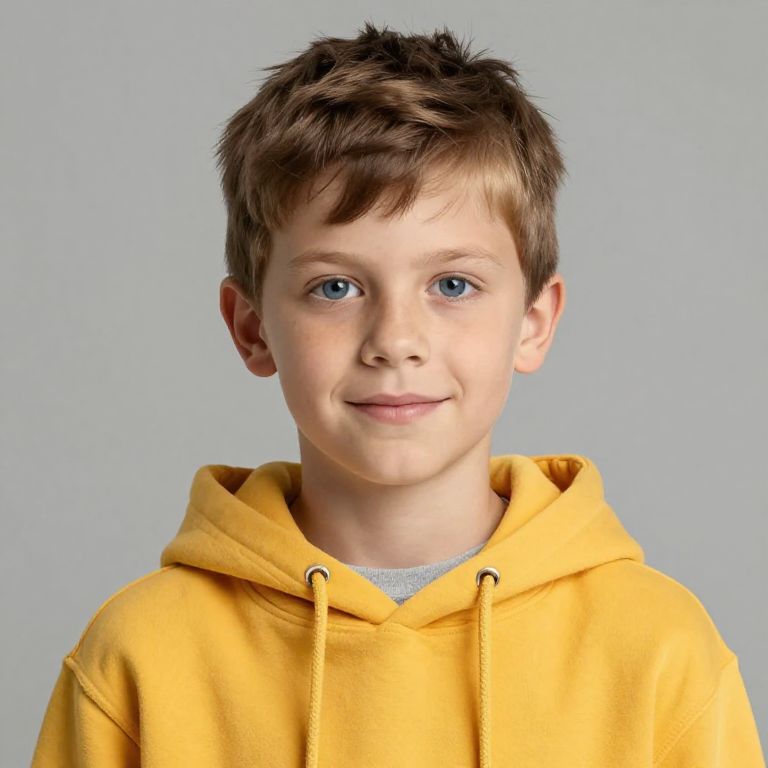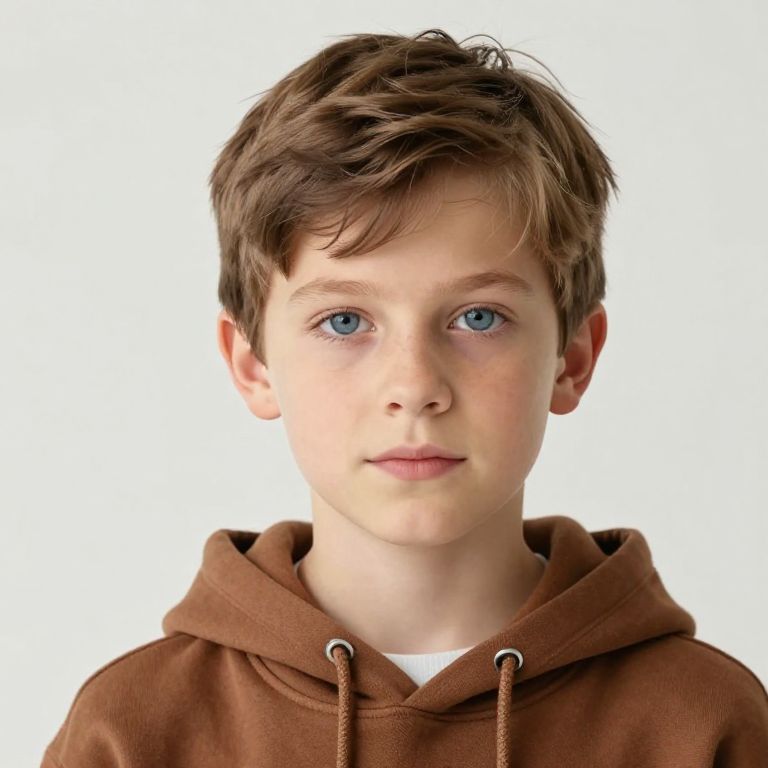 Boy with brown hair and blue eyes wearing a brown and black polka dot hoodie.
