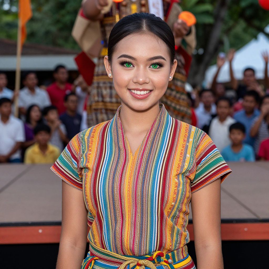 Realistic portrait of a young Filipina woman with bright green eyes, a warm smile, and natural makeup, dressed in a colorful atis and barong outfit from the Visayas region, standing on a traditional wooden stage during a cultural festival with cheering crowd in the background. The woman has big breasts and cute face