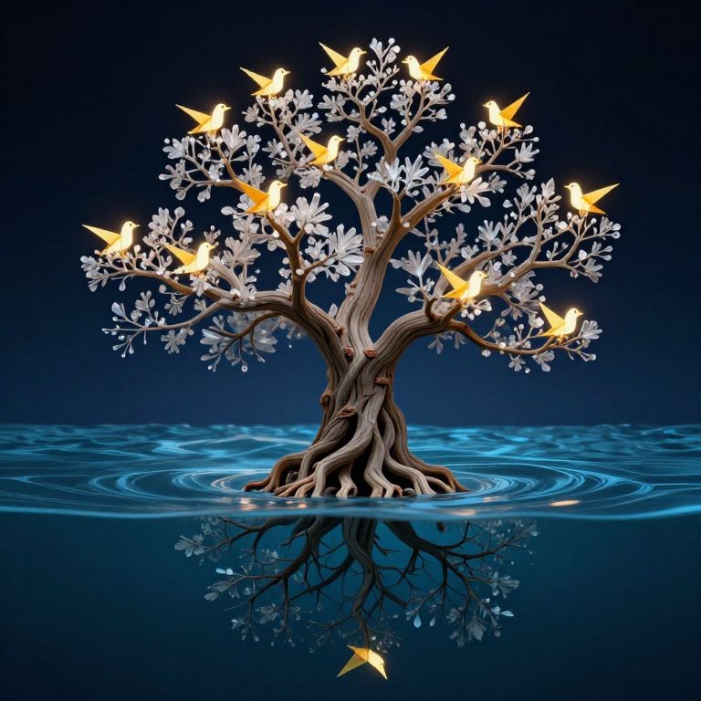 Golden mechanical bird with gears, splashing water, and sparks, floating on ripples in dark background. Digital illustration.