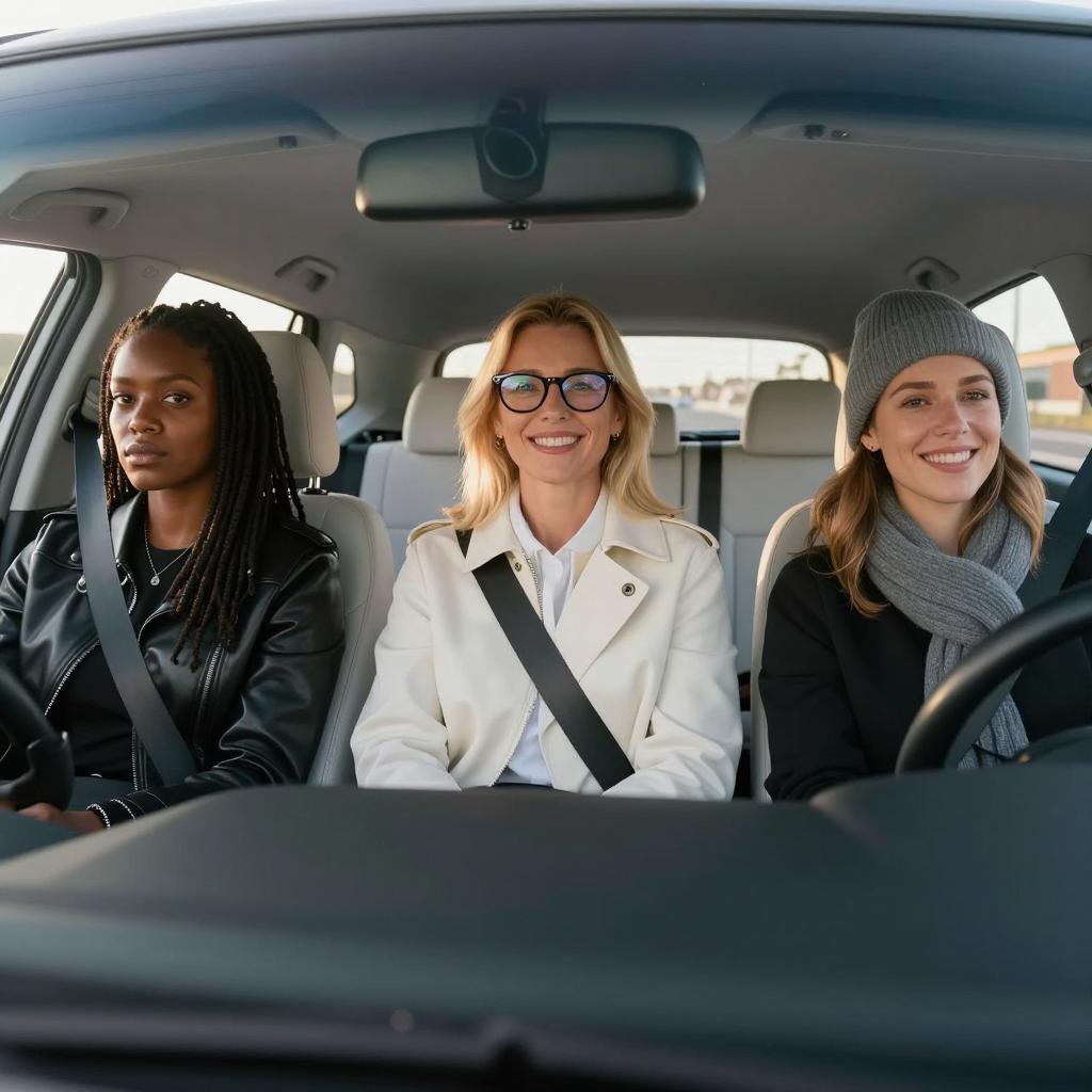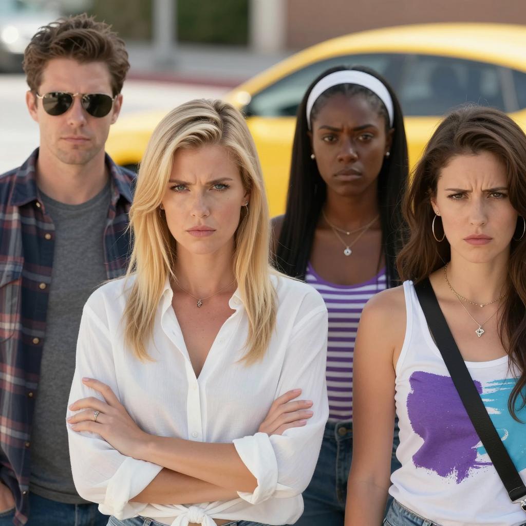 Four people in a car at night. Driver, right foreground, white male, brown hair, white shirt, serious expression. Front passenger, white female, blonde hair, black sleeveless top, neutral expression. Middle passenger, white female, brown hair, black top, animated expression. Rear passenger, white male, dark hair, black suit, neutral expression. Dark car interior, blurred street lights in background.