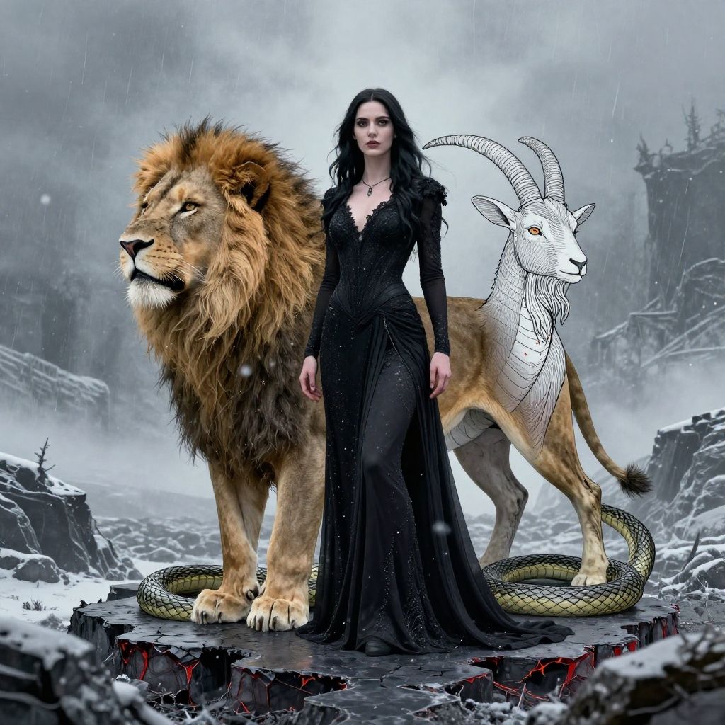 Digital artwork of a dark-haired woman in a black gown standing between a roaring lion and a horned, snake-entwined goat. Snowy