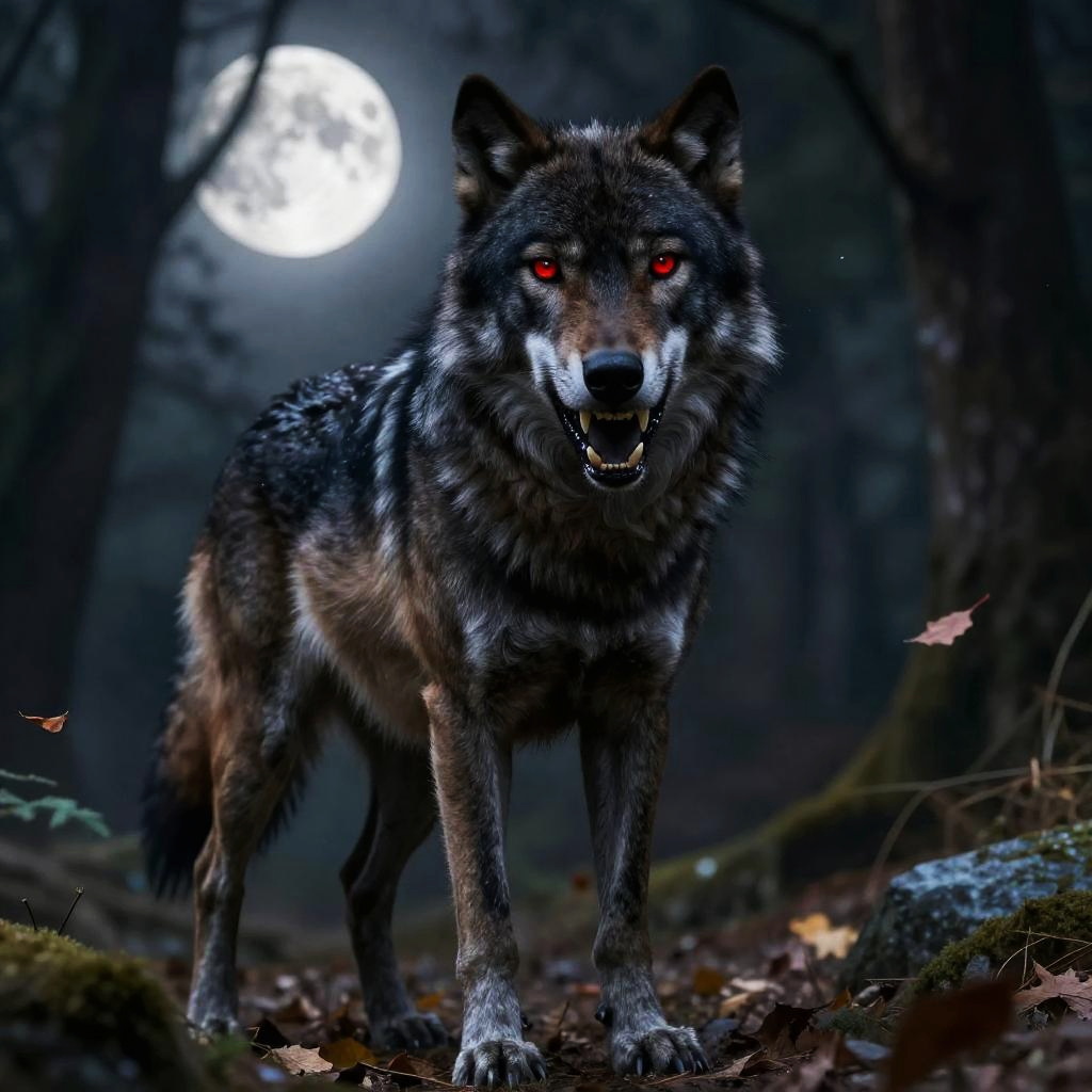 A red eyes angry alpha black wolf snarling in the moonlight, muscles taut, standing tall amidst roaring winds and falling leaves, sharp focus on its glowing eyes and sharp teeth, mystical forest background, dramatic shadows