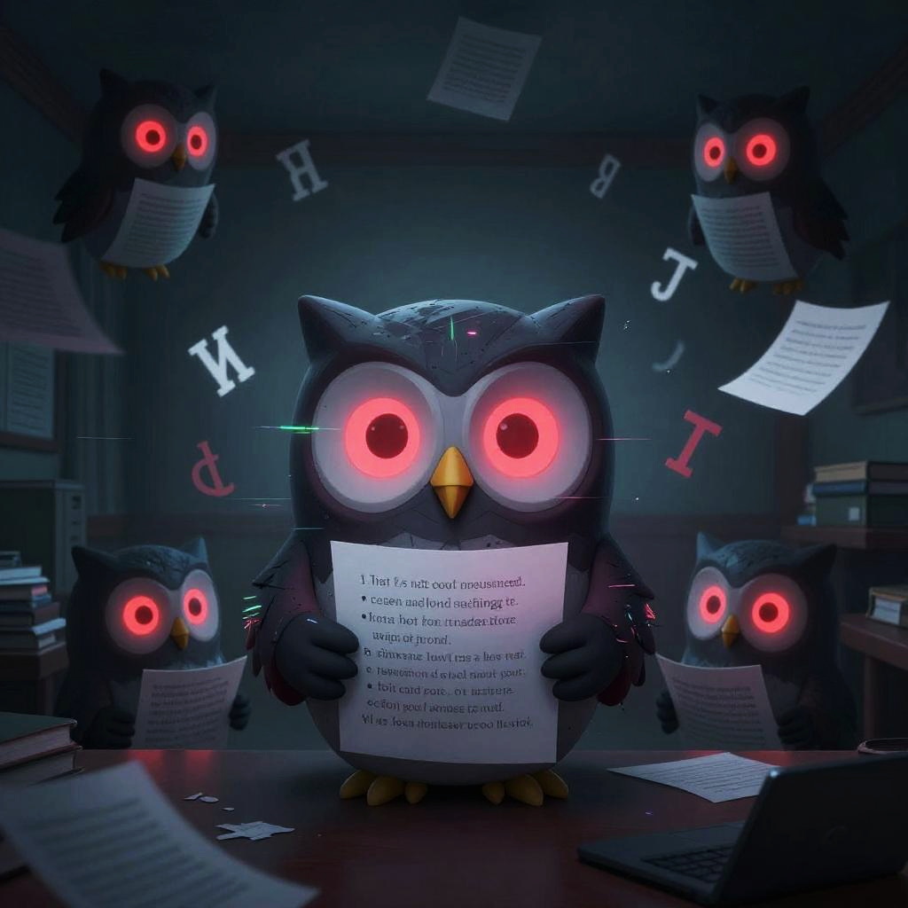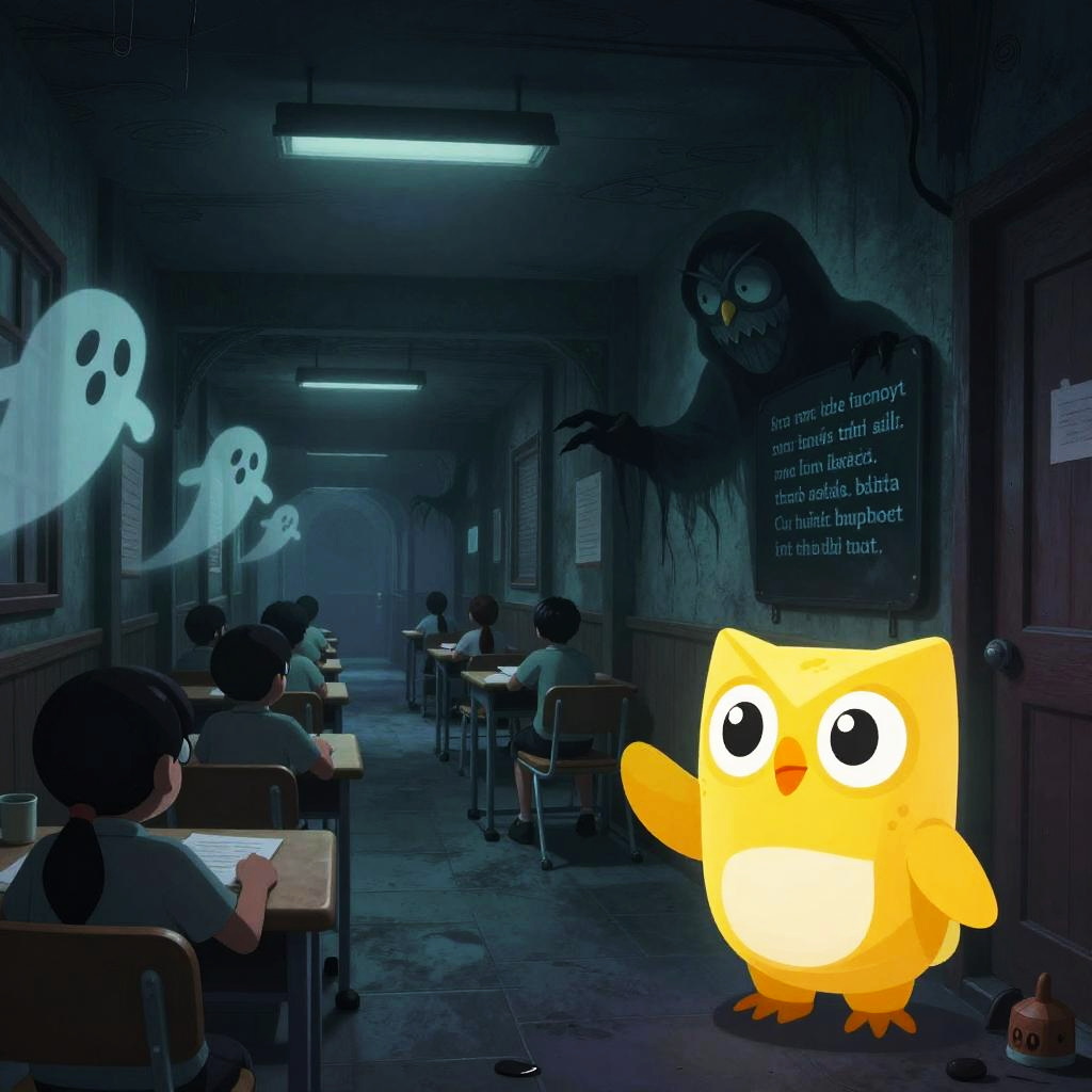 Sinister Duolingo horror scene depicting the green owl as a dark forest spirit stalking a lonely user in their bedroom, shadows creeping along walls filled with fading language phrases, surreal horror mood with intense contrast and eerie green glows illuminating the scene.