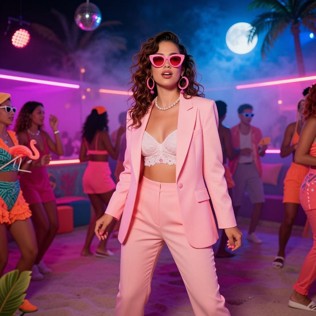 Woman party Miami Vice theme, vibrant 1980s aesthetic with neon pink and cyan lighting, retro pastel outfits, palm trees silhouette at sunset, stylish sunglasses, vintage sports cars in background, energetic nightlife vibe, art style blending realism and synthwave.