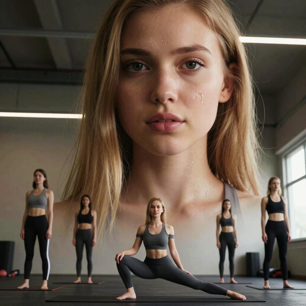 Photograph of a gym with a large, detailed, hyper-realistic close-up of a blonde woman with fair skin and blue eyes, centered in the background. In the foreground, a smaller, realistic image of the same woman sits in a yoga warrior pose on a black mat, wearing a black sports bra and leggings. Five other women, also in black sports bras and leggings, stand in the background in various yoga poses, under bright fluorescent lights. The gym has a modern, industrial design with white walls and large windows.