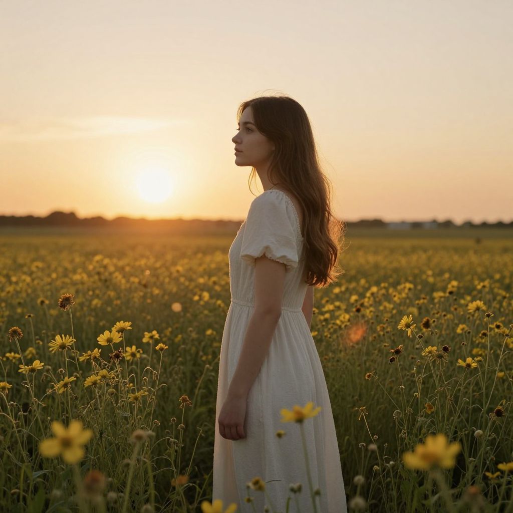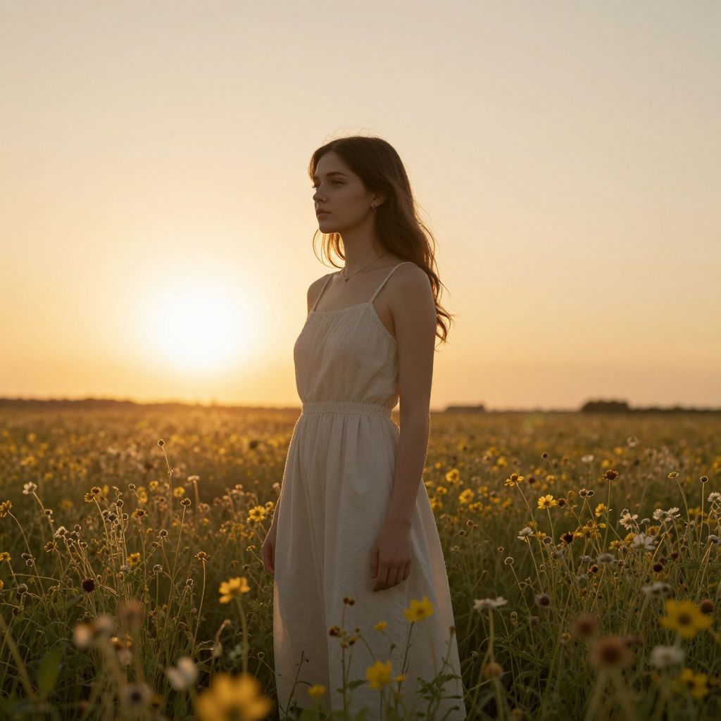 Amidst the golden embrace of a setting sun, a young woman stands serenely in a field of wildflowers, her gaze directed outward, embodying a quiet contemplation of freedom and the transient beauty of the natural world.