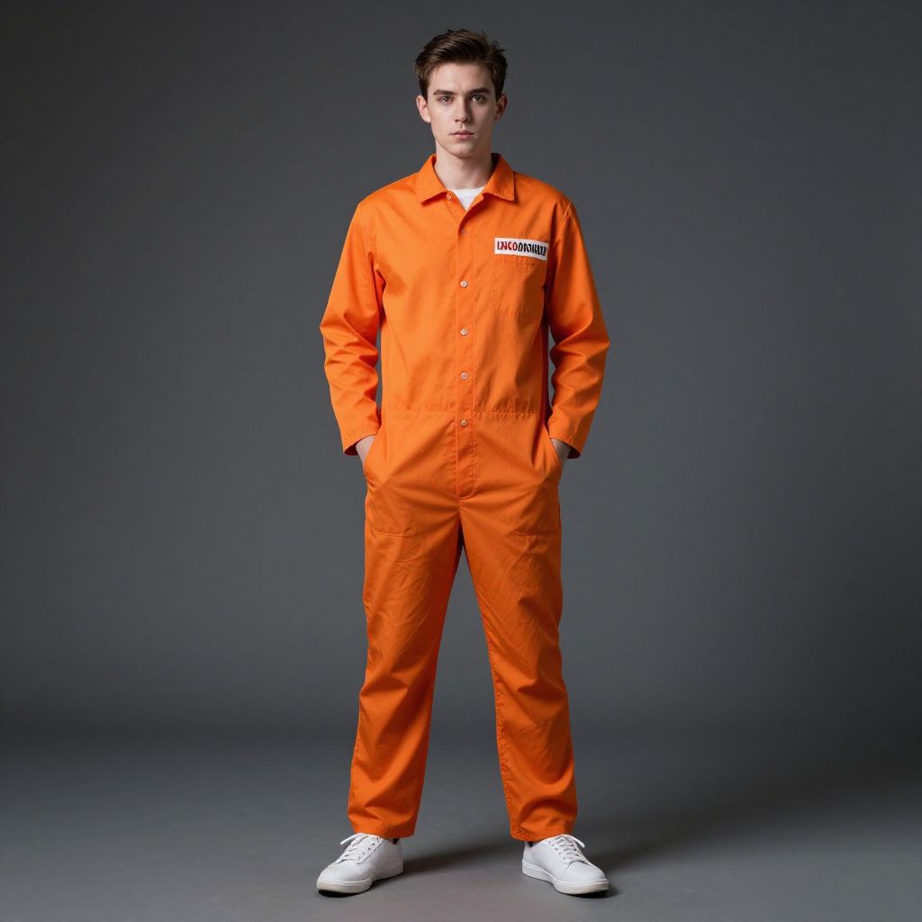 Photograph of a young man with short dark hair, wearing an orange prison jumpsuit, white sneakers, standing against a dark gray background, hands in