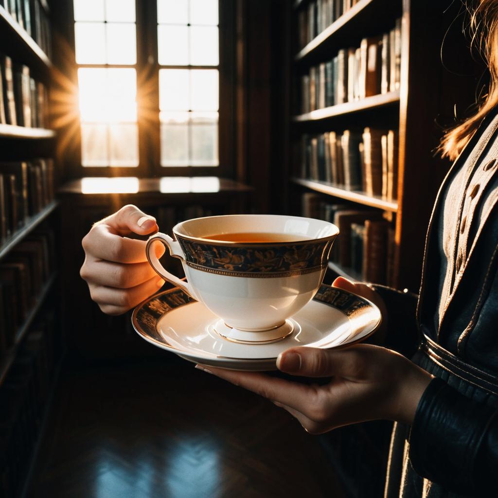 Close-up of a slender woman's hands holding a delicate porcelain teacup and matching saucer, set in a warmly sunlit vintage library filled with leather-bound books. The scene features realistic sunset lighting highlighting the intricate design on the teacup and the wooden bookshelves framing the background.