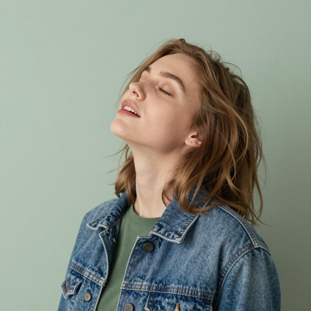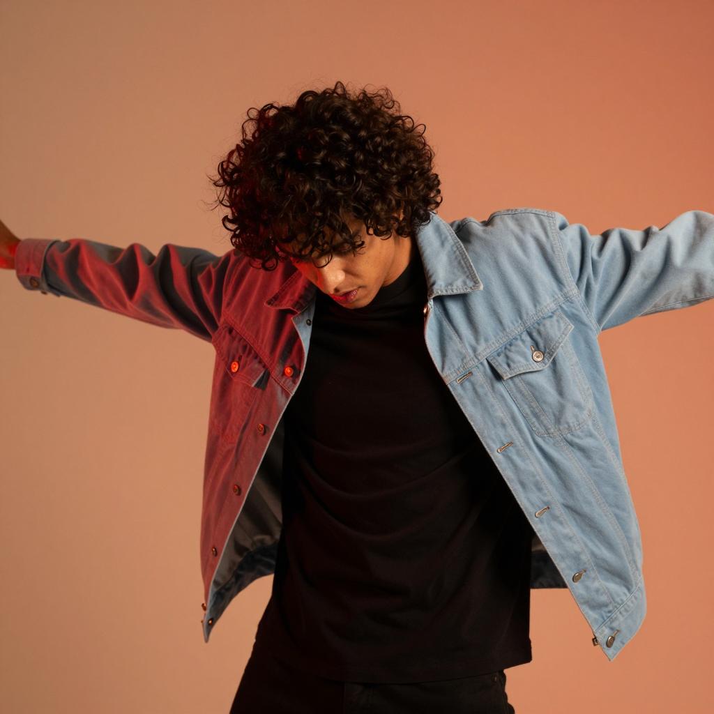 Blurry photograph of a person with curly blonde hair and blue sunglasses, wearing a white long-sleeve shirt, standing among large green banana leaves. Sunlight filters through the leaves. Person's face is out of focus. Green fence in background.