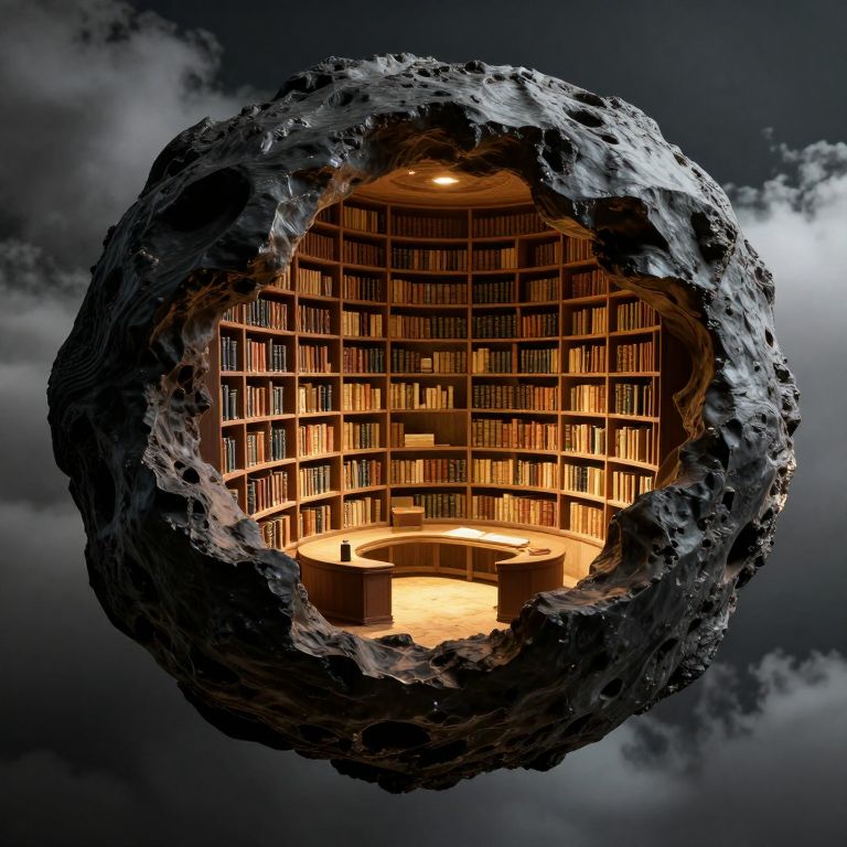 Photorealistic CGI image of a spherical, rocky library floating in a dark, cloudy sky. The library's exterior is rough, textured, and black, resembling a crater. Inside, warm, yellow lighting illuminates shelves filled with neatly arranged books, creating a cozy atmosphere. A circular wooden desk with a single, small, shadowy figure stands in the center. The contrast between the dark exterior and the warm, inviting interior draws attention to the hidden, tranquil space within. The overall composition suggests a secret, futuristic haven.