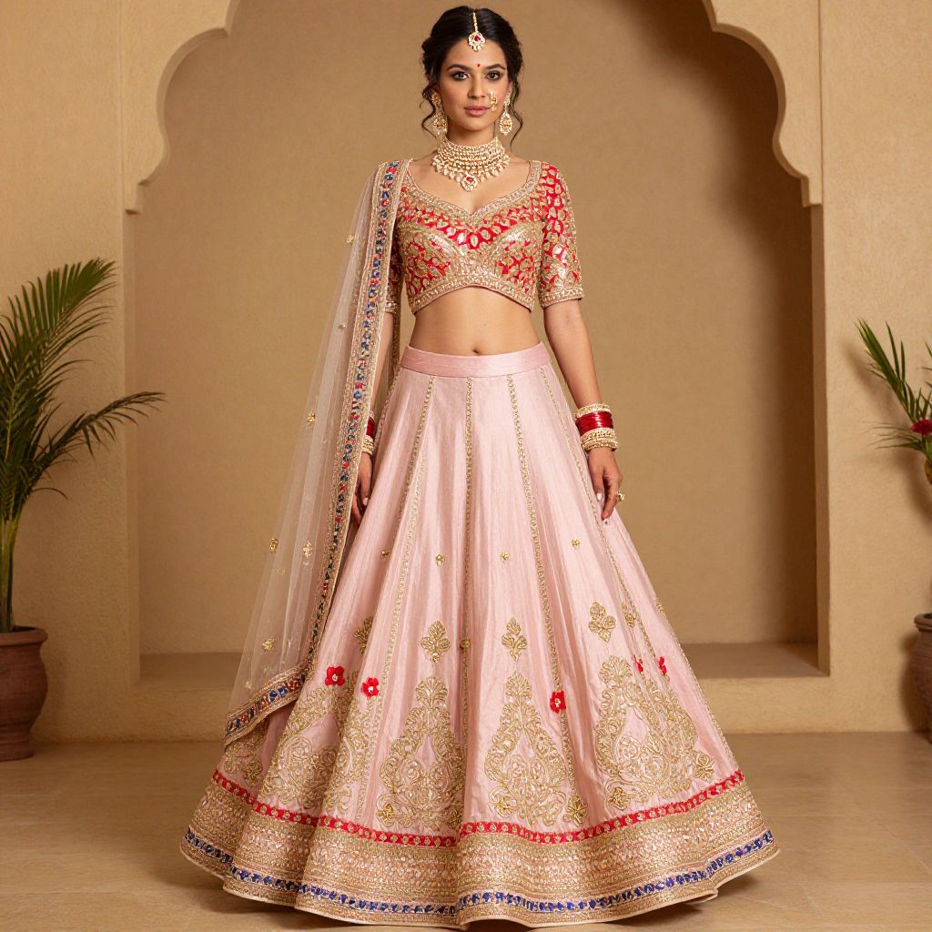 "Top Wedding Dress India, a woman in a pink lehen with a gold and red blouse"