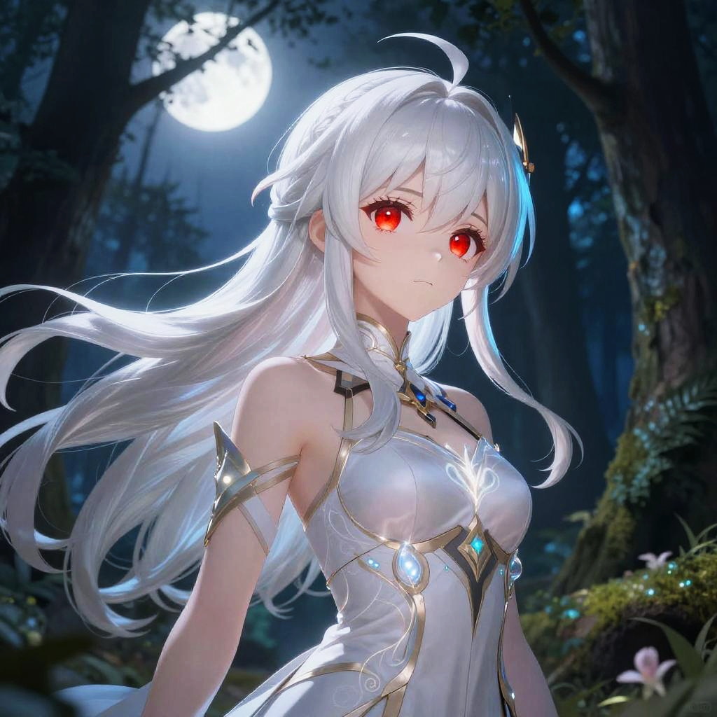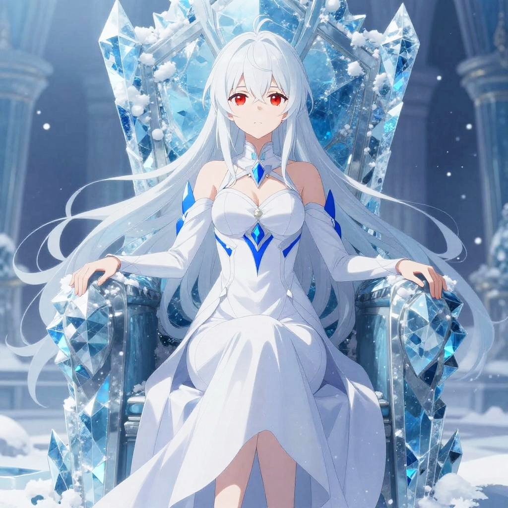 Red eyes white hair anime girl sitting on a throne made of ice crystals in a winter palace, elegant flowing white dress with blue accents, soft snowflakes drifting around, cold and serene atmosphere, mystical aura, detailed facial expression showing calm strength, anime fantasy artwork