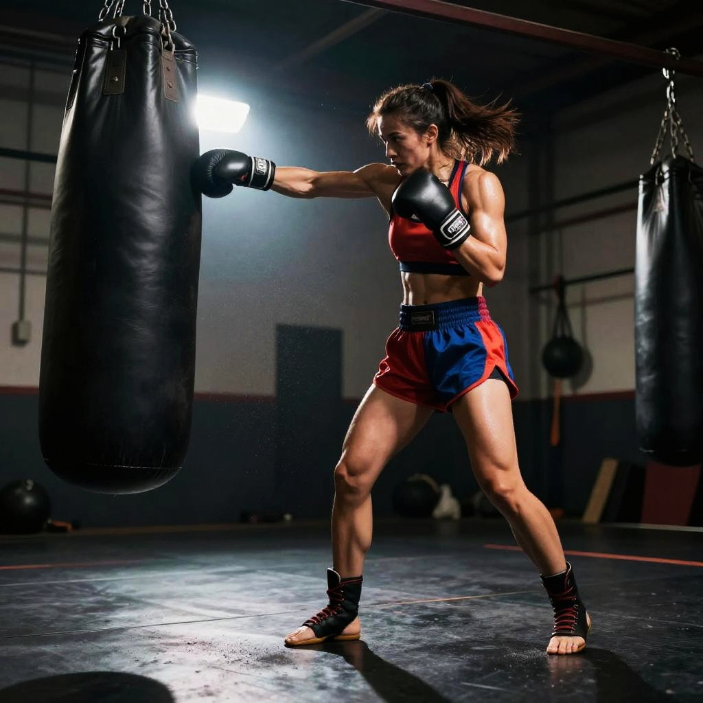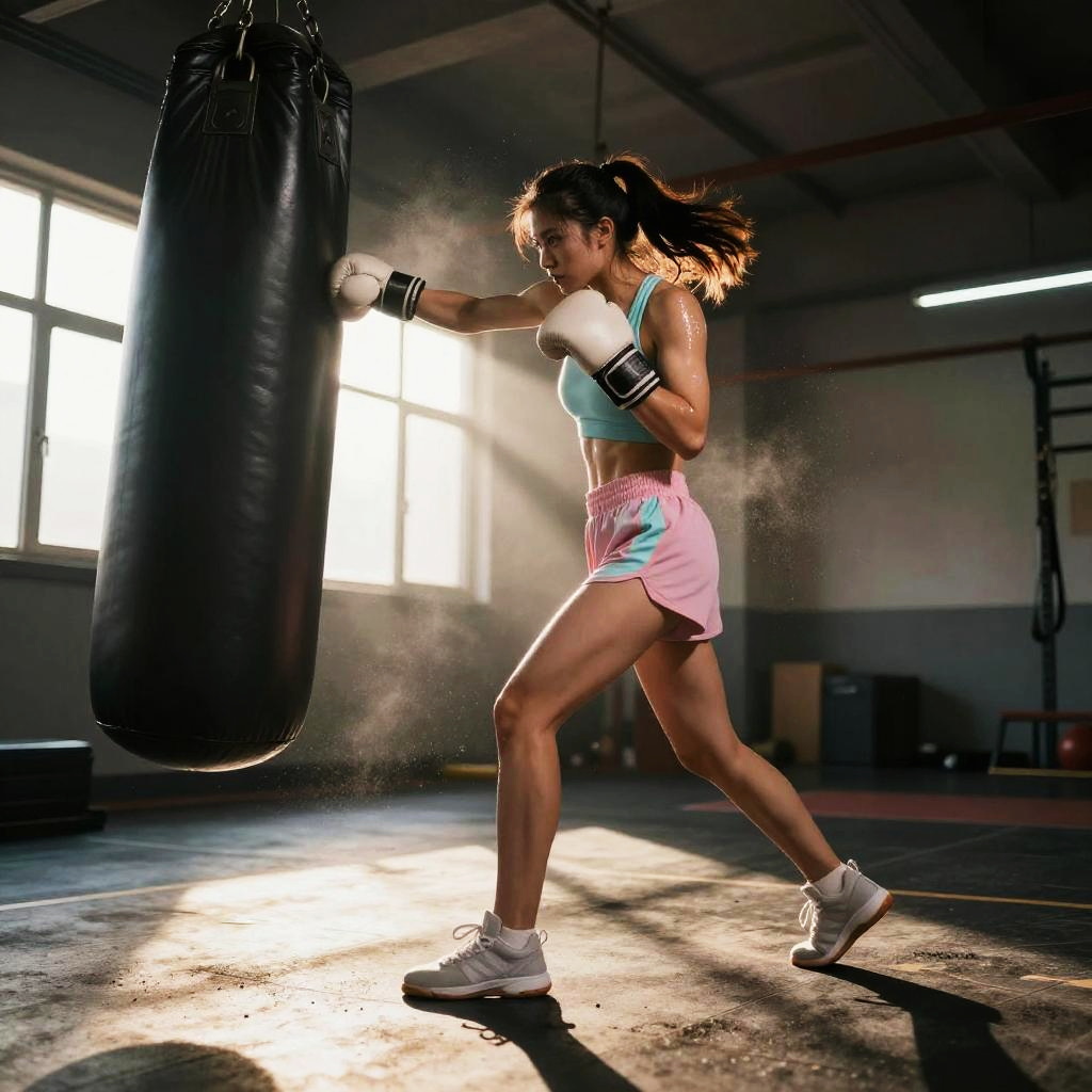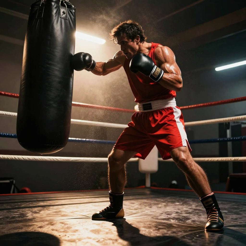 A burly boxer punching a heavy bag in old school boxing gym, vibrant athletic wear, muscular arms, energetic and fierce, sweat mist and chalk dust, dynamic low angle perspective, dramatic rim light, volumetric beams, high contrast, ultra-detailed textures, gritty atmosphere, motion blur trails, defined deltoids, reflective floor scuffs, background bokeh, cinematic composition, gritty photorealism, golden hour lighting