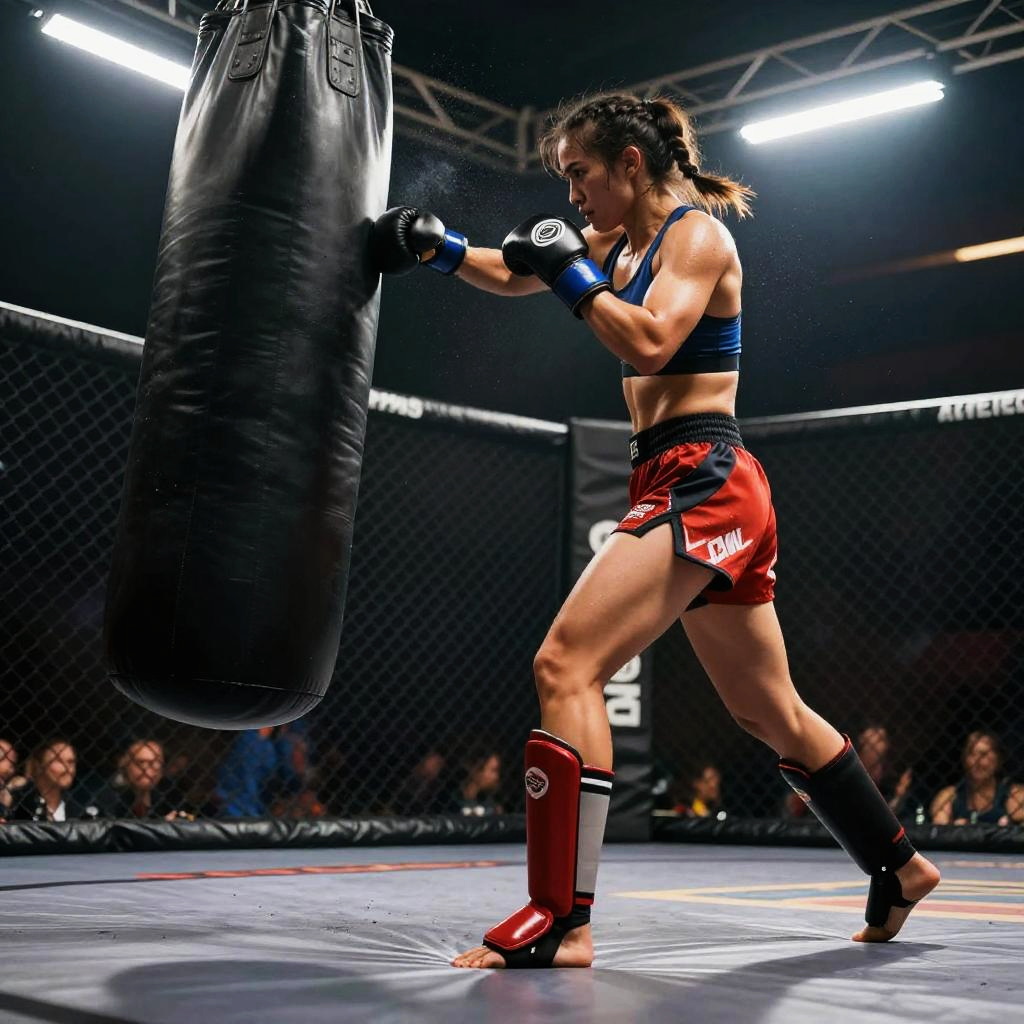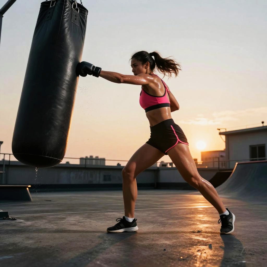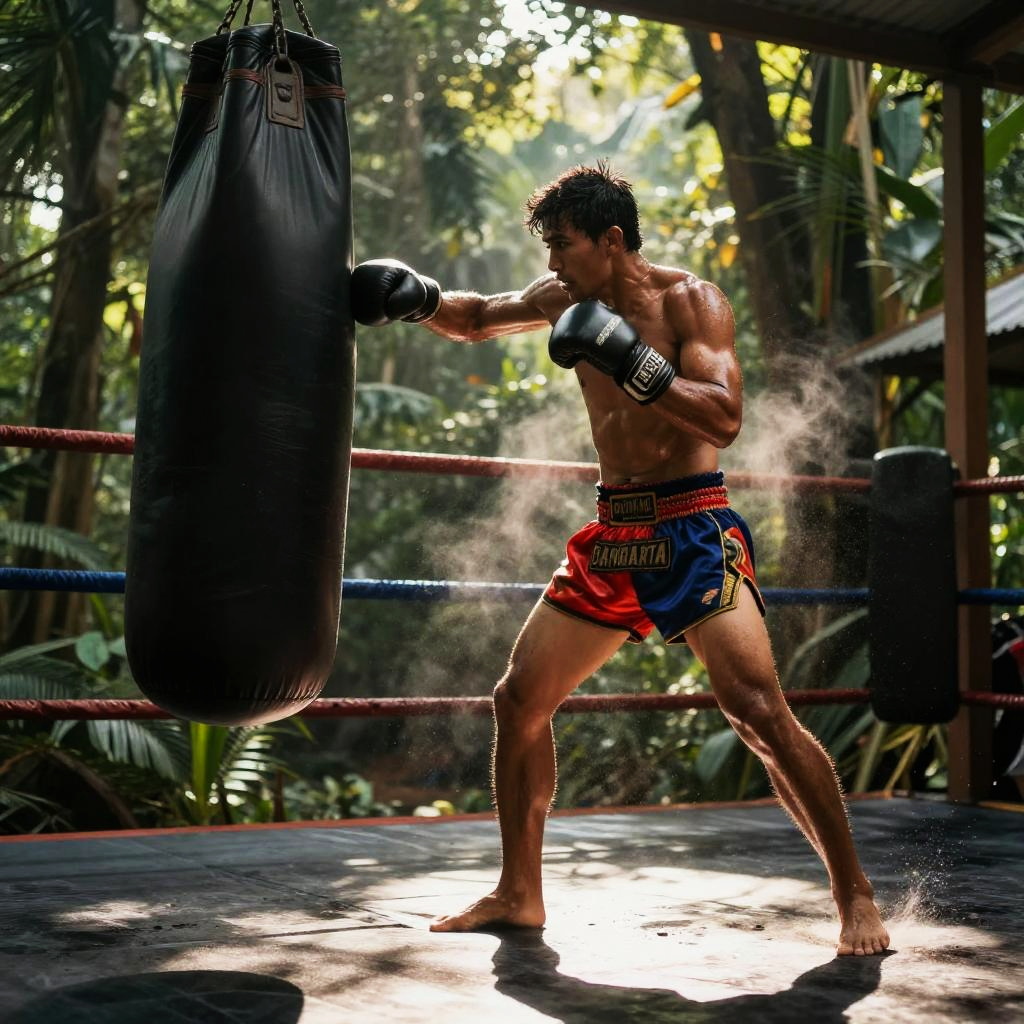 A burly boxer punching a heavy bag in old school boxing gym, vibrant athletic wear, muscular arms, energetic and fierce, sweat mist and chalk dust, dynamic low angle perspective, dramatic rim light, volumetric beams, high contrast, ultra-detailed textures, gritty atmosphere, motion blur trails, defined deltoids, reflective floor scuffs, background bokeh, cinematic composition, gritty photorealism, golden hour lighting