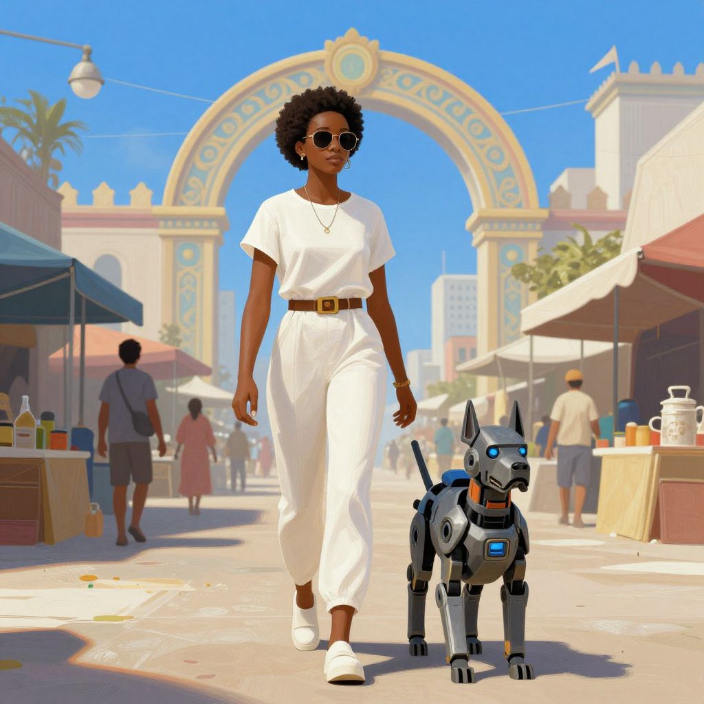 A photograph of a young woman with dark skin and curly hair, wearing a white crop top, high-waisted cream-colored pants, and black sandals, walking down black steps. She has on round, white sunglasses and carries a black crossbody bag. The background features a large, black, futuristic spacecraft with yellow-orange lighting. The image has a vibrant, almost hyper-realistic style, with strong contrasts and rich colors. The woman's confident stride and the sleek, sci-fi aesthetic create a striking visual contrast.